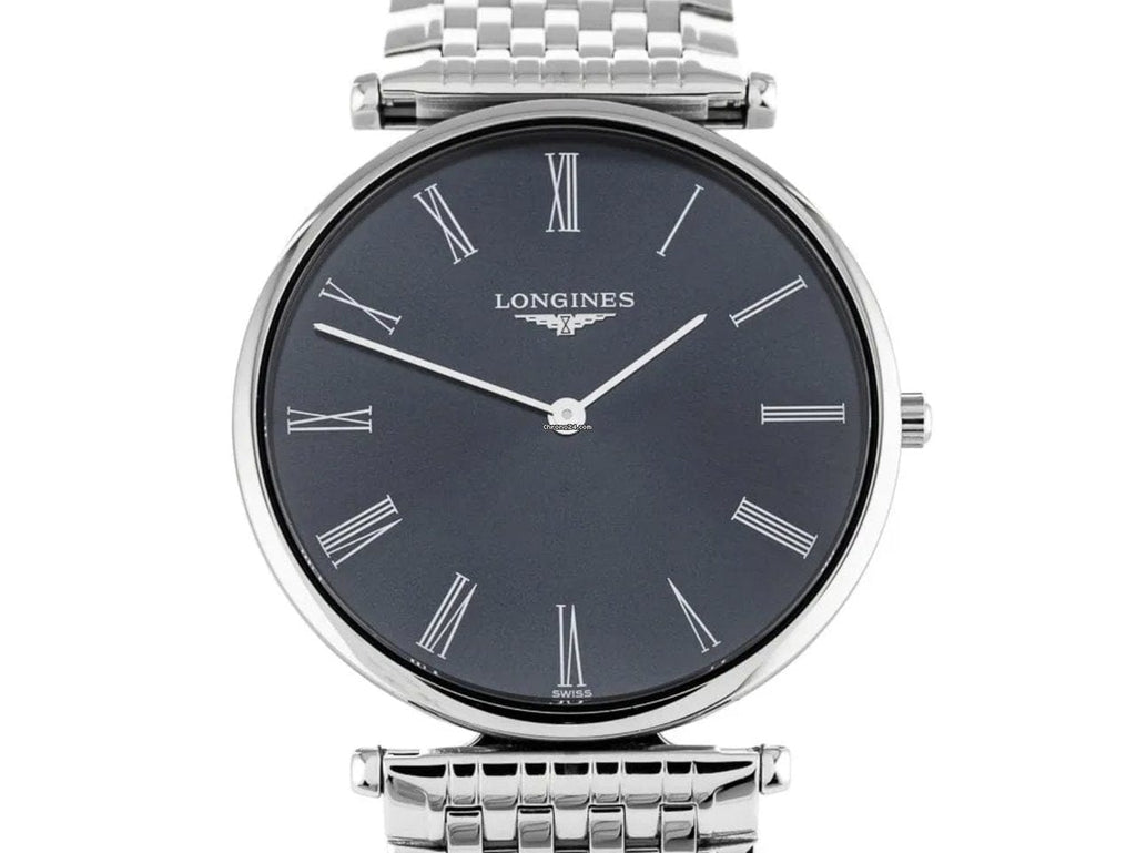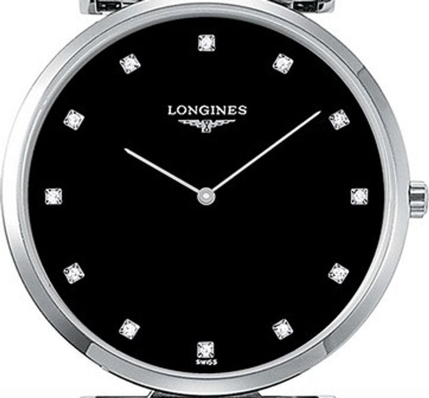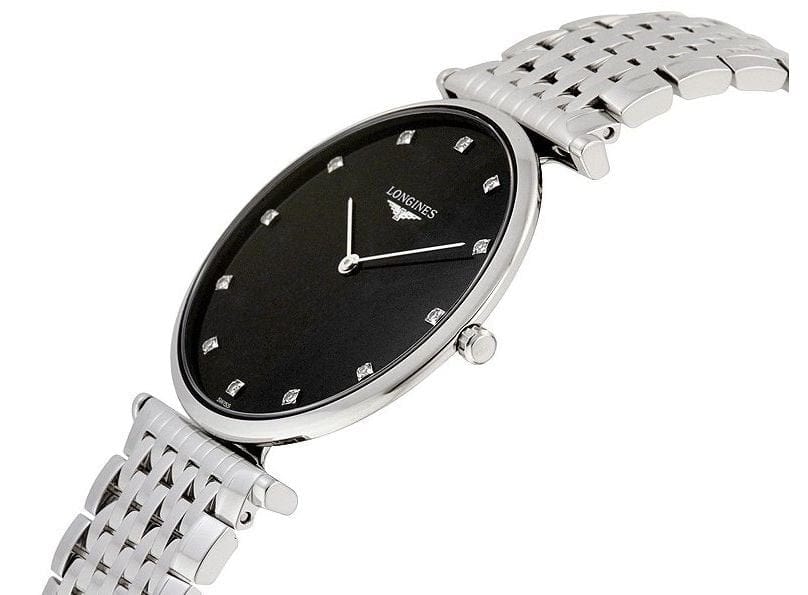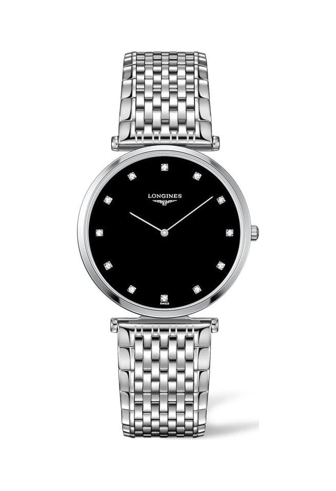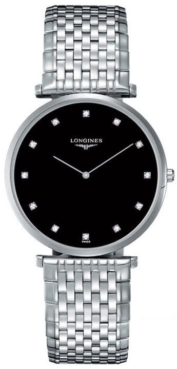 Black dial enhanced by silver-tone hands. Silver-tone stainless steel case with a silver-tone stainless steel band. Quartz movement. 30 meters / 100 feet water resistance. Fixed bezel. Scratch Resistant Sapphire crystal. Solid caseback. Hidden Fold Over clasp. Pull / Push crown. Case size 36 mm. Band 20 mm x long. Longines L4.755.4.58.6 La Grande Classique Watch.