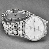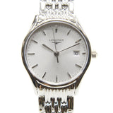 stainless steel Bracelet. stainless steel case. stainless steel bezel. dial with Silver hands and Black Roman numerals hour markers. . quartz movement. mineral crystal. 25mmx 25mmx 8mm case. 13mm band width. 30 meters water resistant. L4.259.4.72.6