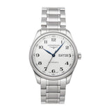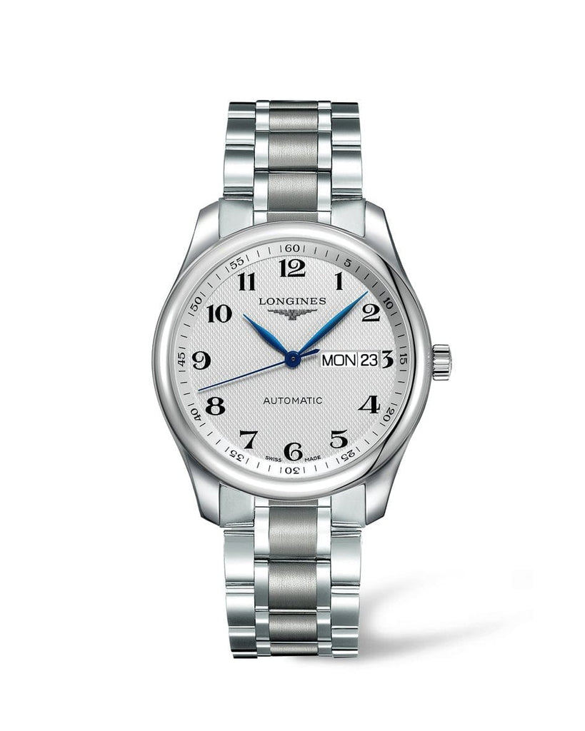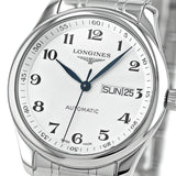 Fitted with Longines caliber L636, the Master Collection Day-Date displays both day and date through a window at 3 o'clock. It is available in a number of variations; ref. L2.755.4.78.6 has a stainless steel case and bracelet.