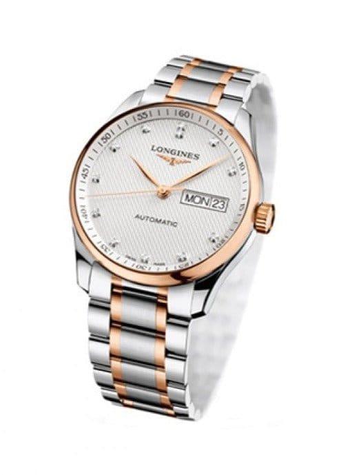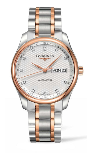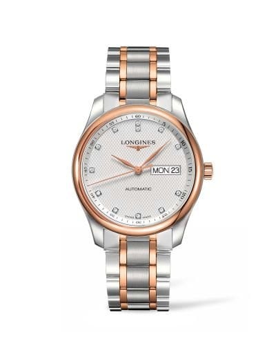 Longines Master Collection with diamonds indexes with a steel case and rose gold plated bezel. This model comes with day and date display at 3 o'clock, sapphire crystal, transparent case back with sapphire crystal as well.