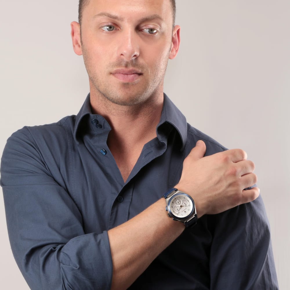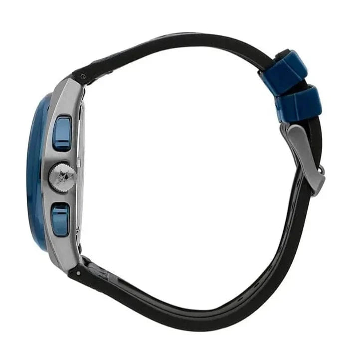 Anthracite PVD stainless steel case with a blue leather strap. Fixed blue PVD stainless steel bezel. White dial with luminous silver-tone arrow-shaped hands and Arabic numeral hour markers. Minute markers around the outer rim. Dial Type: Analog. Luminescent hands and markers. Date display at the 6 o'clock position. Chronograph - three sub-dials displaying: 60 second, 30 minute and 24 hours.