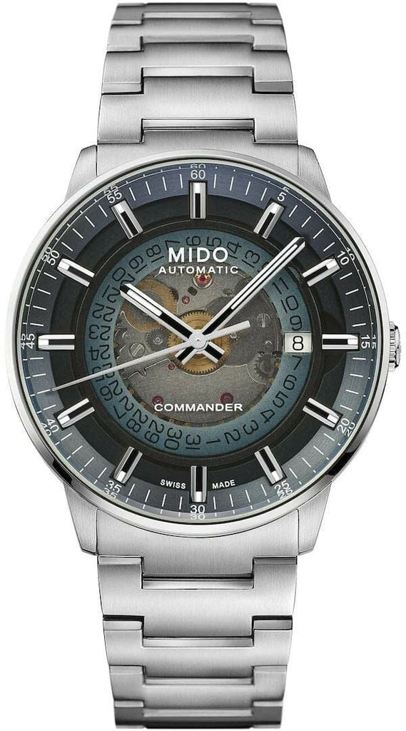 Let’s talk about that dial. We’ve seen plenty of skeleton or open-heart dial designs in our time but Mido does something absolutely unique and brilliant here on the Commander. The dial is translucent and offers users an interesting look into the intricate movement housed in the case. Made of acrylic and adorned with an original graduated smokey effect, the blue dial becomes increasingly opaque around the edges. The wearer would therefore be able to admire the intricate gear work and date wheel of the well-constructed movement. Diamond-cut baton indices are applied throughout the dial, offering a nice contrast to a dial that tries to steal the show every time. A 3 o’clock date wheel is also present, standing out perfectly so that wears will not be confused by the entire date wheel that can be seen behind the translucent dial.
