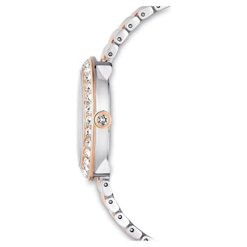 - The dial also features Swarovski crystal hour markers with rose gold-tone hour and minute hands.