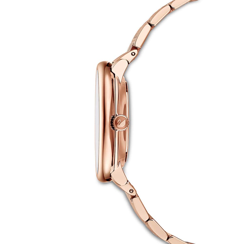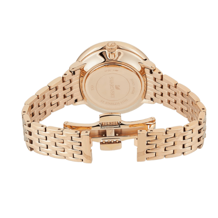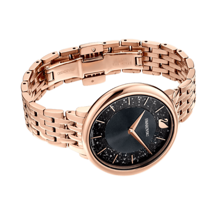 The design for this watch by Swarovski is inspired by the serene beauty and purity of raindrops. This imagery is emphasized by the flowing shape of the rose-gold tone PVD coated stainless steel case, which is filled with approximately 1,000 sparkling black crystals. The black sunray dial and the sparkles create a unique contrasting brilliance. Meanwhile, a rose-gold tone PVD coated bracelet secures the watch to the wrist, making it an elegant addition to your everyday outfits.