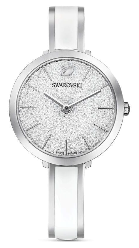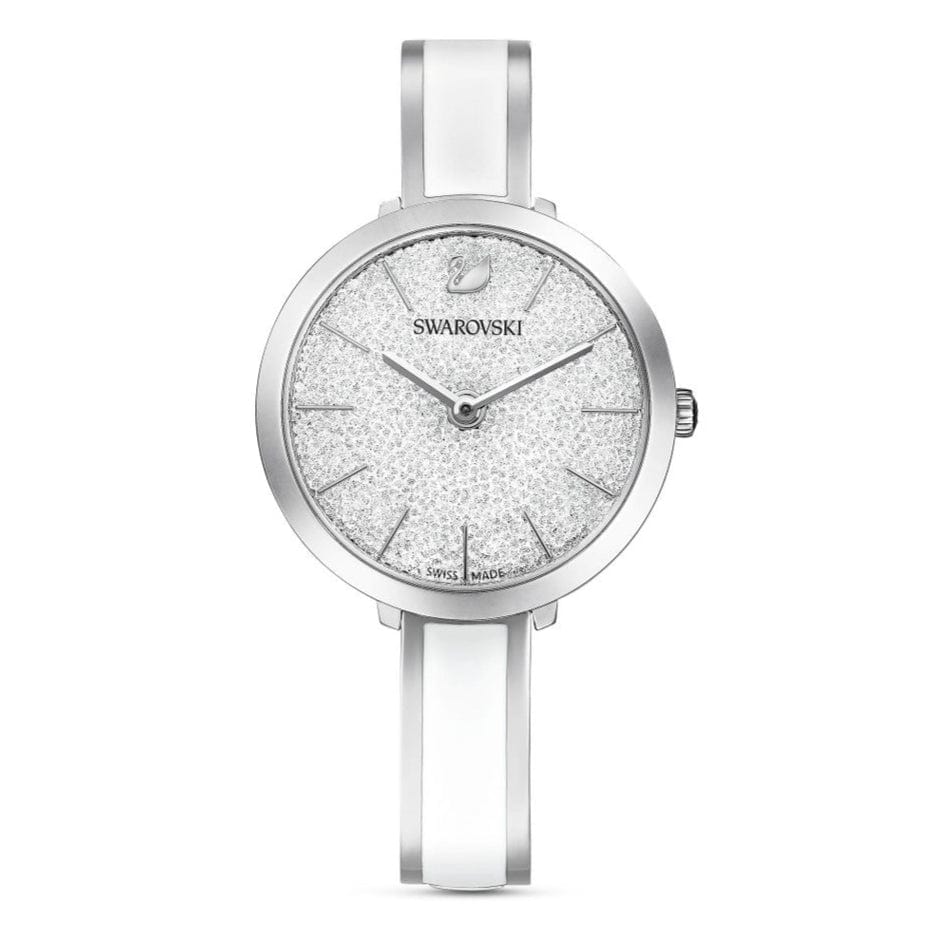 This easy-to-wear Swarovski bangle watch is effortlessly chic and adorned with crystal-clear sparkle. The modern dial and elegant stainless steel case, filled with approximately 1,000 clear crystals, shimmer with fresh brilliance. The jewelry-inspired bangle, also crafted from stainless steel, features a minimalist design in glossy white enamel. The watch is a perfect accessory for this season's style and beyond. Made in Switzerland, it is water-resistant to 50 m. Adjustable links ensure it fits any wrist size.