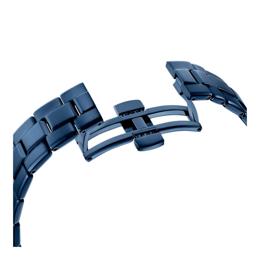 - Classic design: Engineered in blue-tone PVD-coated stainless steel with a dark blue sunray dial and sparkling white crystal index markers, plus a date window, complete with blue crystal bezel