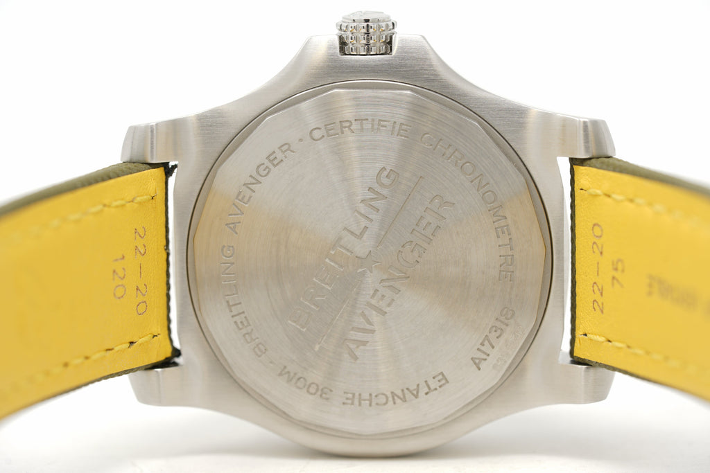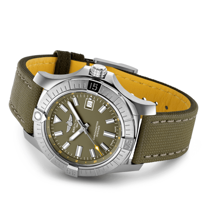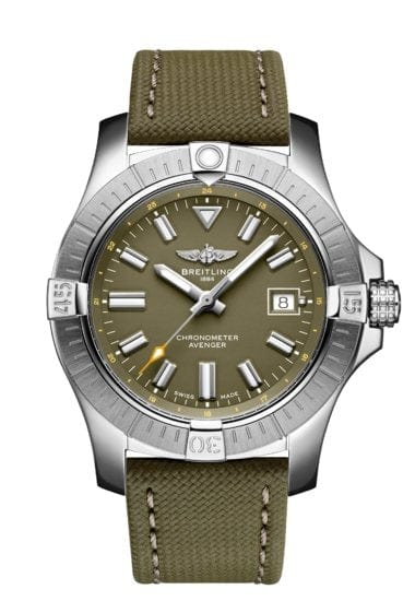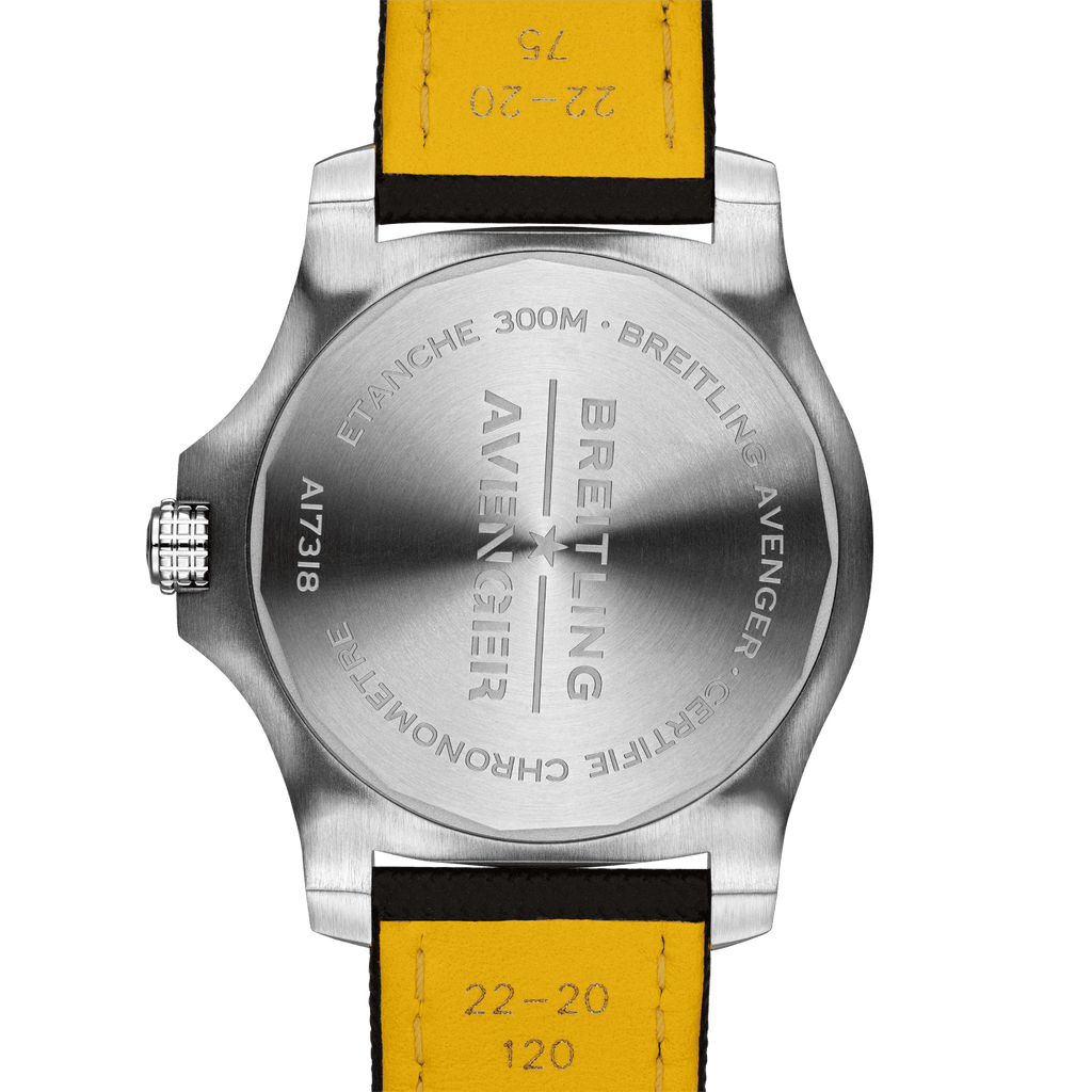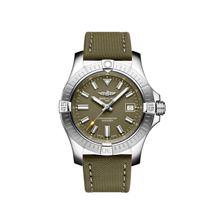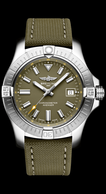 Bold, extremely robust and shock resistant, the Avenger Automatic 43 features a clean dial offering optimal legibility. As a true Breitling Avenger, it can be used wearing gloves and offers unrivalled safety and reliability to any airborne adventurer. The Avenger Automatic 43 features a sturdy 43mm stainless-steel case, colorful dial and a choice of a stainless-steel bracelet, or matching military leather strap that fits either a stainless-steel pin buckle or folding clasp. Thanks to its rugged bezel and its special grip-pattern on the crown, the Avenger Automatic 43 can be easily operated wearing gloves.