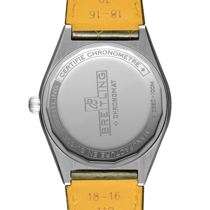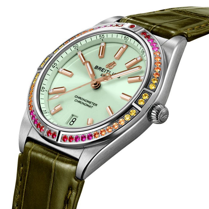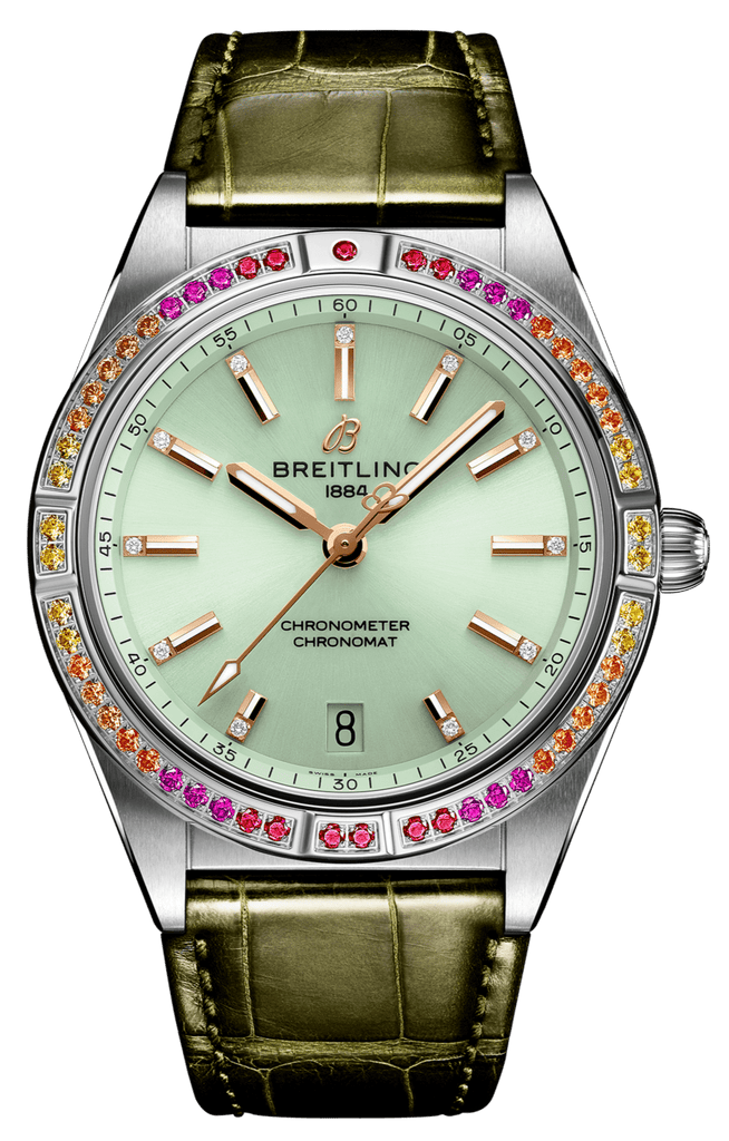 Breitling Chronomat Automatic 36 South Sea watch. Model reference: A10380611L1P1. Steel case (Gem-set). Mint green dial. Automatic movement. Green alligator leather strap with steel folding clasp. Swiss made. Watch comes in original packaging, with set of documents and 5 years warranty.