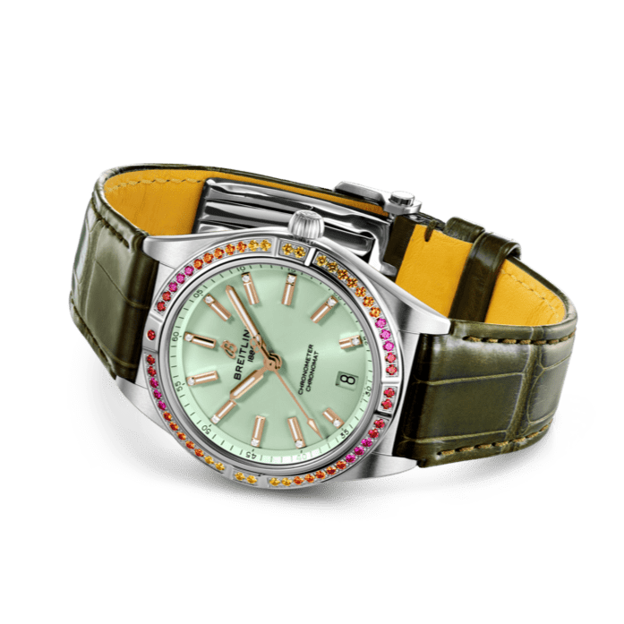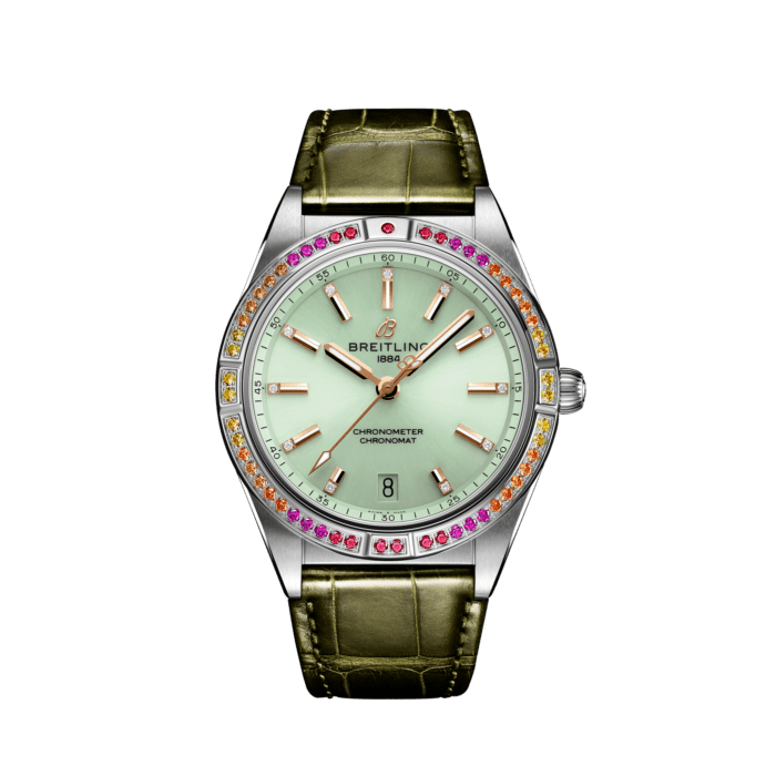 With eye-catching colors and luminescence, the Chronomat South Sea Capsule Collection evokes the intoxicating vibes of summer, marine life and lush greenery. Available in three distinctive versions, the Chronomat Automatic 36 South Sea Capsule Collection is the spirited sister of Breitling’s latest Chronomat for women. This elegantly modern retro-inspired watch is for ladies looking to stand out from the crowd. Featuring special lacquered dials with golden indexes and hands, diamond-set hour markers and cocktail-hued gem-set bezels, the Chronomat South Sea are paired to color-matched shiny alligator straps with folding clasps. The Chronomat Automatic 36 South Sea are powered by the Breitling Caliber 10, a COSC-certified chronometer.