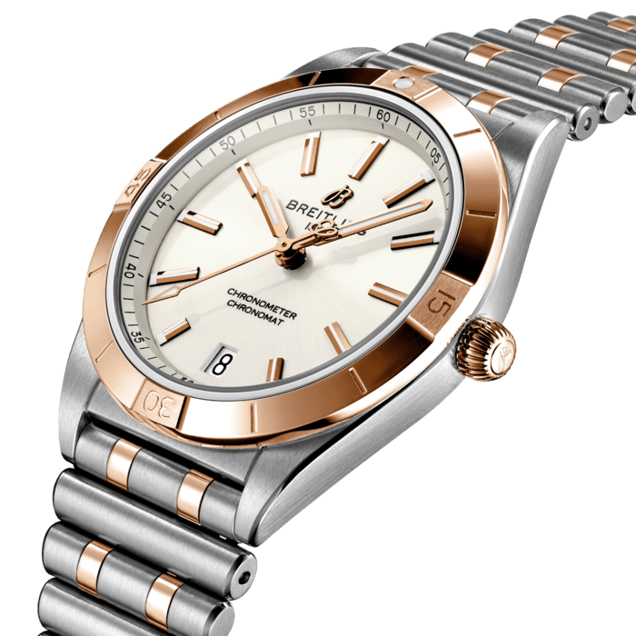 Stylish yet elegant, the modern-retro inspired Chronomat Automatic 36 is the versatile sporty and chic watch for any occasion. It is available in an array of metal cases, from cool stainless steel, to goes-with-everything bicolor, or even luxurious 18k red gold. Women craving extra sparkle will also be able to opt for diamond-set bezels, indices, and colorful dials. Featuring Breitling’s iconic and comfortable “Rouleaux” bracelet with a butterfly clasp, the Chronomat Automatic 36 is powered by the Breitling Caliber 10, a COSC-certified chronometer.