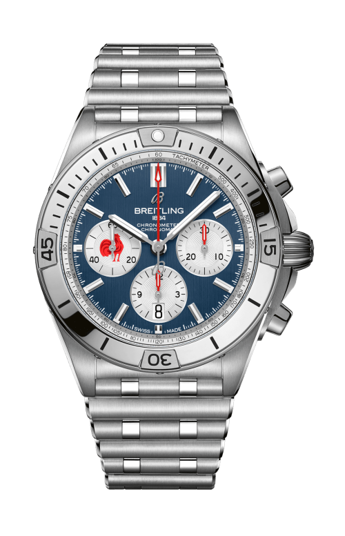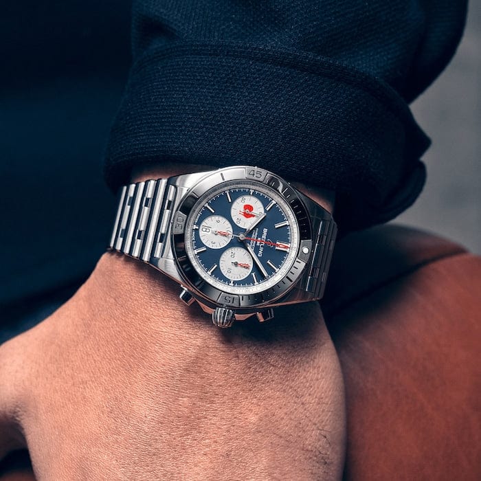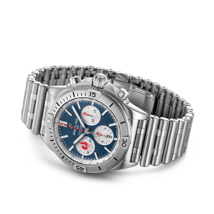 The timepiece also features signature Chronomat characteristics, including raised rider tabs at the 15-minute marks, an easy-grip onion crown, and a classic rouleaux bracelet.