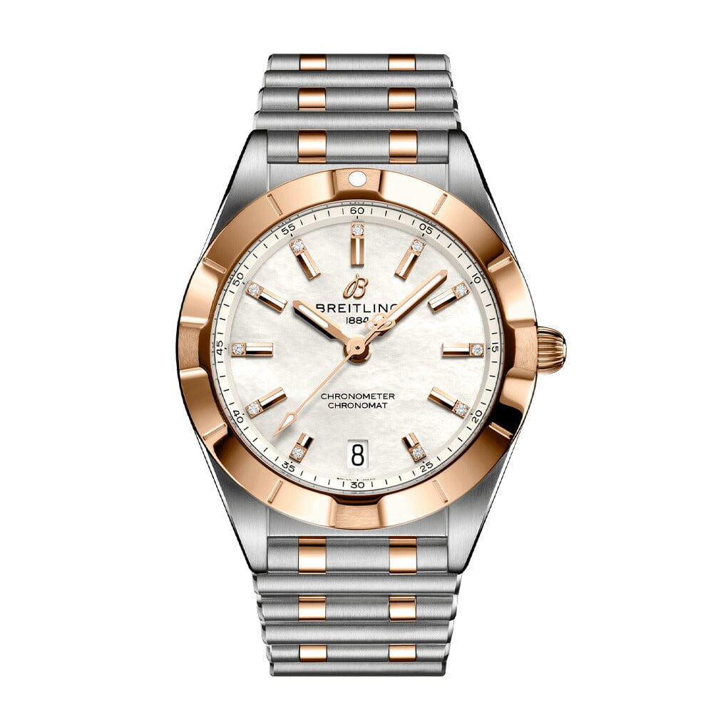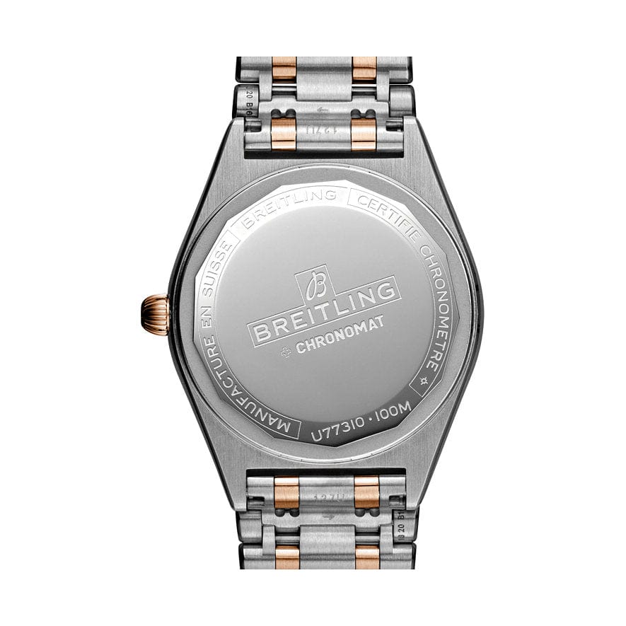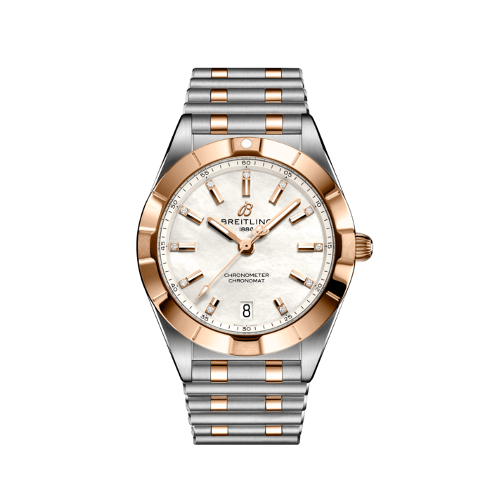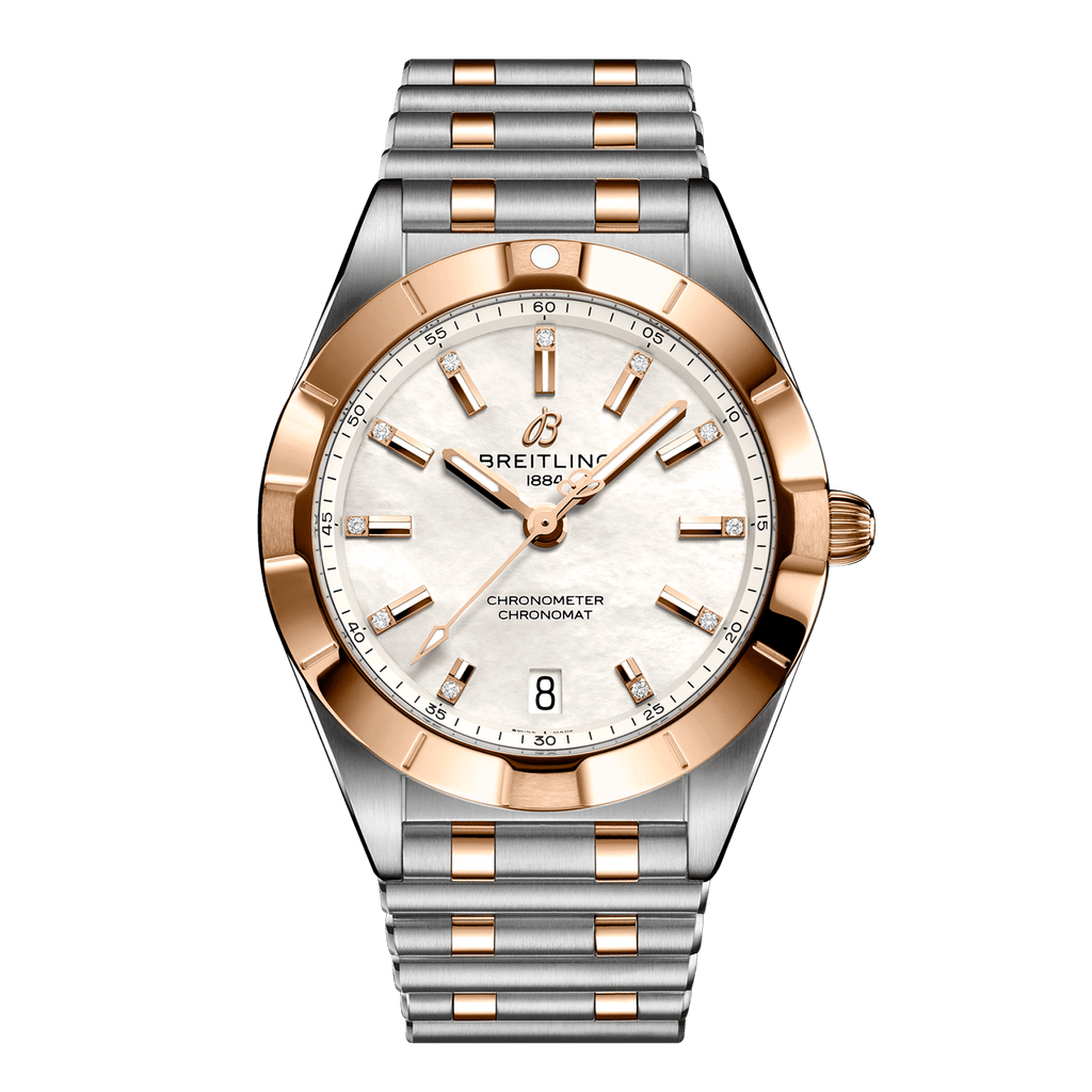 Stylish yet elegant, the modern-retro inspired Chronomat 32 is the versatile sporty and chic watch for any occasion. It is available in an array of metal cases, from cool stainless steel, to goes-with-everything bicolor, or even luxurious 18k red gold. Women craving extra sparkle will also be able to opt for diamond-set bezels, indices, and colorful dials. Featuring Breitling’s iconic and comfortable “Rouleaux” bracelet with a butterfly clasp, the Chronomat 32 is powered by the Breitling Caliber 77, a COSC-certified SuperQuartz™ chronometer.