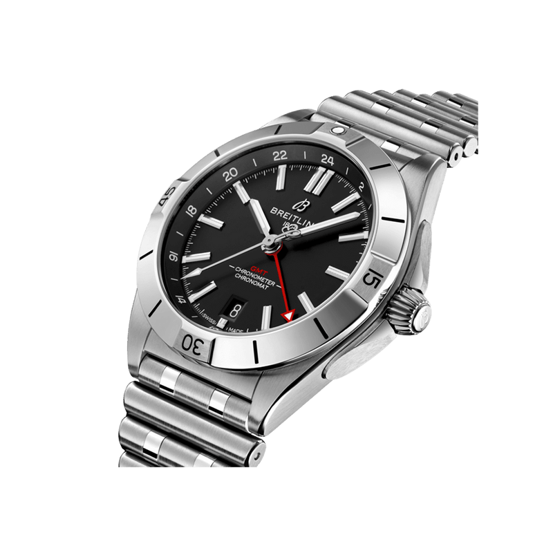 Subtle dial colors, combined with an all-steel case and bracelet, work with any wardrobe. Meanwhile, the tone-on-tone 24-hour scale lets the red GMT hand speak for itself. The Breitling Caliber 32 powers the GMT complication. Its 24-hour scale lets the user track a second time zone and know at a glance whether it’s day or night, while the “onion” crown (a classic Chronomat feature named for its fluted-dome shape) allows for easy adjustments.