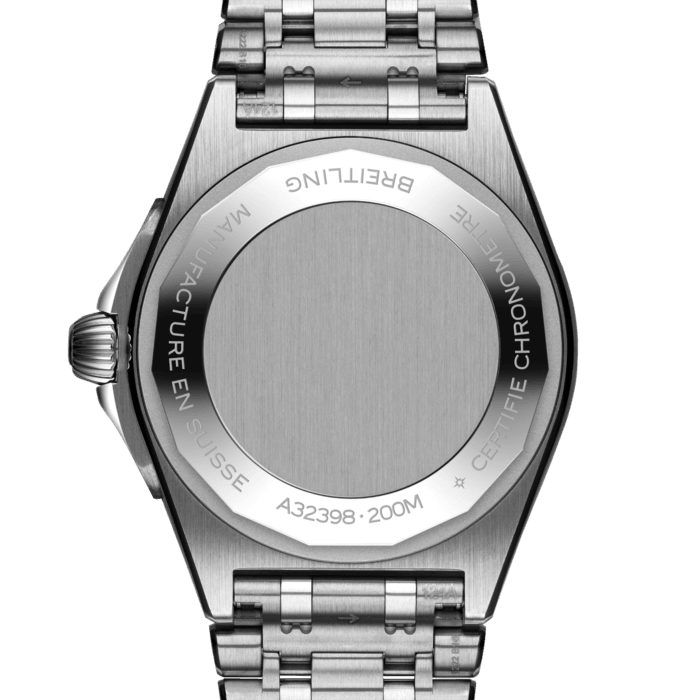 The Breitling Caliber 32 powers the GMT complication. Its 24-hour scale lets the user track a second time zone and know at a glance whether it’s day or night, while the “onion” crown (a classic Chronomat feature named for its fluted-dome shape) allows for easy adjustments. As an all-purpose sports watch, meant to cross over between Breitling’s air, land and sea universes, the GMT 40 has an impressive 200m water resistance.
