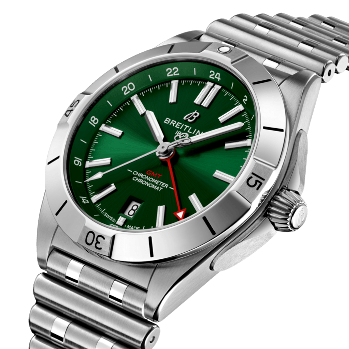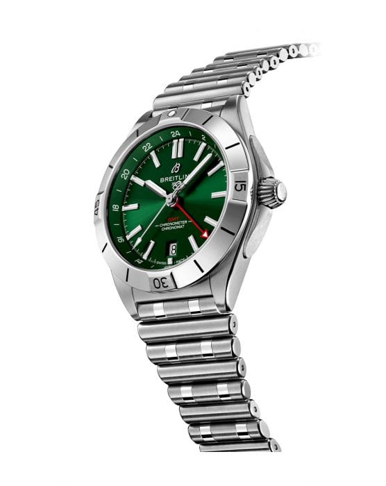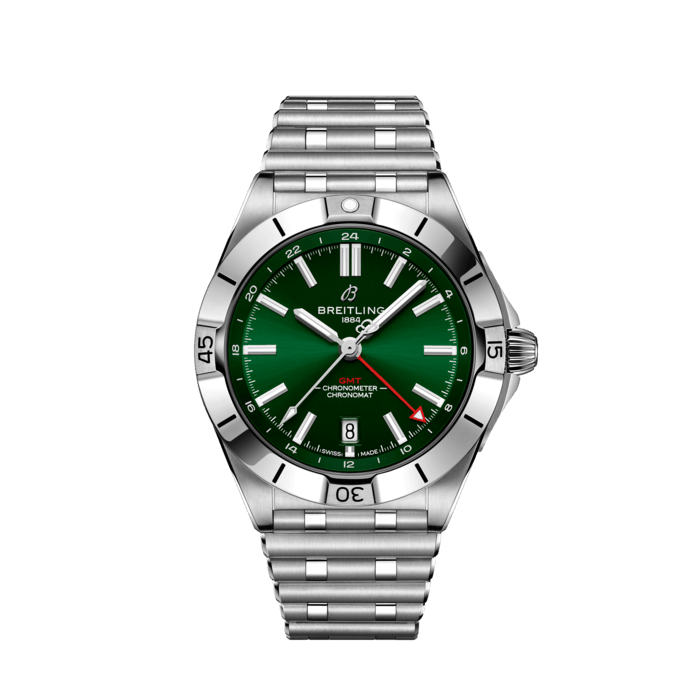 Breitling Chronomat Automatic GMT 40 Stainless Steel watch. Model reference: A32398101L1A1. Stainless steel case. Green dial. Automatic movement. Stainless steel bracelet. Swiss made. The watch comes in the original packaging, with a set of documents and 2 years warranty.