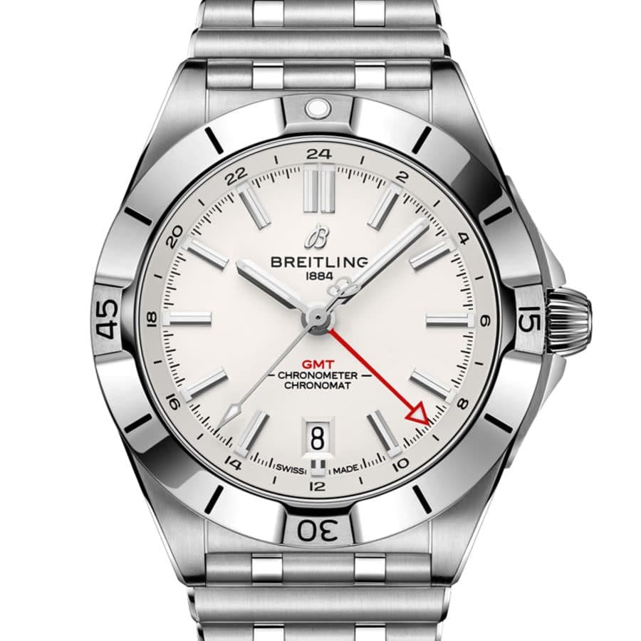 Subtle dial colors, combined with an all-steel case and bracelet, work with any wardrobe. Meanwhile, the tone-on-tone 24-hour scale lets the red GMT hand speak for itself. The Breitling Caliber 32 powers the GMT complication. Its 24-hour scale lets the user track a second time zone and know at a glance whether it’s day or night, while the “onion” crown (a classic Chronomat feature named for its fluted-dome shape) allows for easy adjustments.