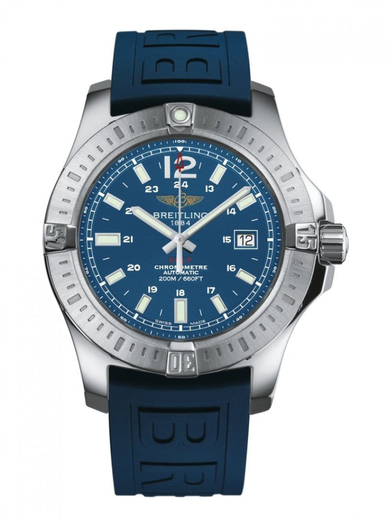 Stainless steel case with a blue rubber (diver pro III) strap. Uni-directional rotating stainless steel bezel. Blue dial with luminous silver-tone hands and index hour markers. An Arabic numeral appears at the 12 o'clock position. 24 hour. Minute markers. 1/100th markers around the outer rim. Dial Type: Analog. Luminescent hands and markers. Date display at the 3 o'clock position. Breitling calibre 17 automatic movement with a 40-hour power reserve. Scratch resistant sapphire crystal. Screw down crown. Solid case back. Case size: 44 mm. Case thickness: 11.25 mm. Round case shape. Band width: 22 mm. Deployment clasp. Water resistant at 200 meters / 660 feet. Functions: date, hour, minute, second. Sport watch style. Watch label: Swiss Made. Breitling Colt Automatic Blue Dial Men's Watch A1738811-C906-157S-A20DSA.2.
