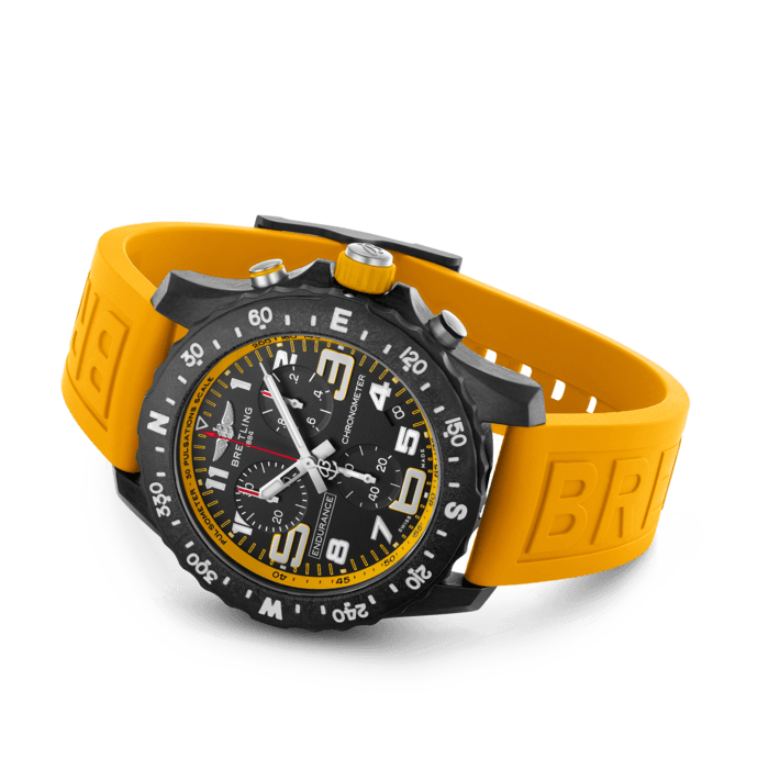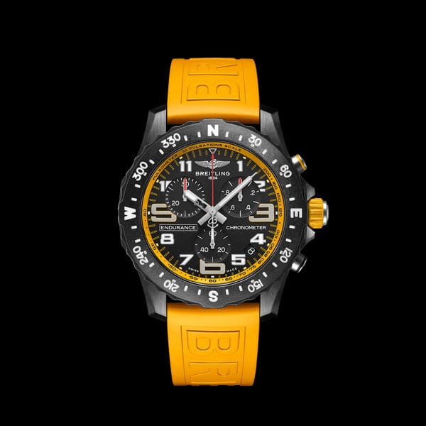 The Endurance Pro features an ultra-light Breitlight® case, a robust material 3.3 times lighter than titanium and 5.8 times lighter than stainless steel. Non-magnetic, thermally stable and hypoallergenic, Breitlight® is highly resistant to scratches, traction and corrosion. It also has a touch that is warmer than metal and a slightly textured effect accentuating the originality of the design. Exclusive to Breitling, it is 100% Swiss-made. Offered with a set of colorful dial and rubber straps fitting a Breitlight® double tang-type buckle, the Endurance Pro can also be paired with one of Breitling’s colorful Outerknown ECONYL® yarn single-piece strap. Powering the Endurance Pro is Breitling’s Caliber 82, a COSC-certified SuperQuartz™ chronograph delivering exceptional precision.