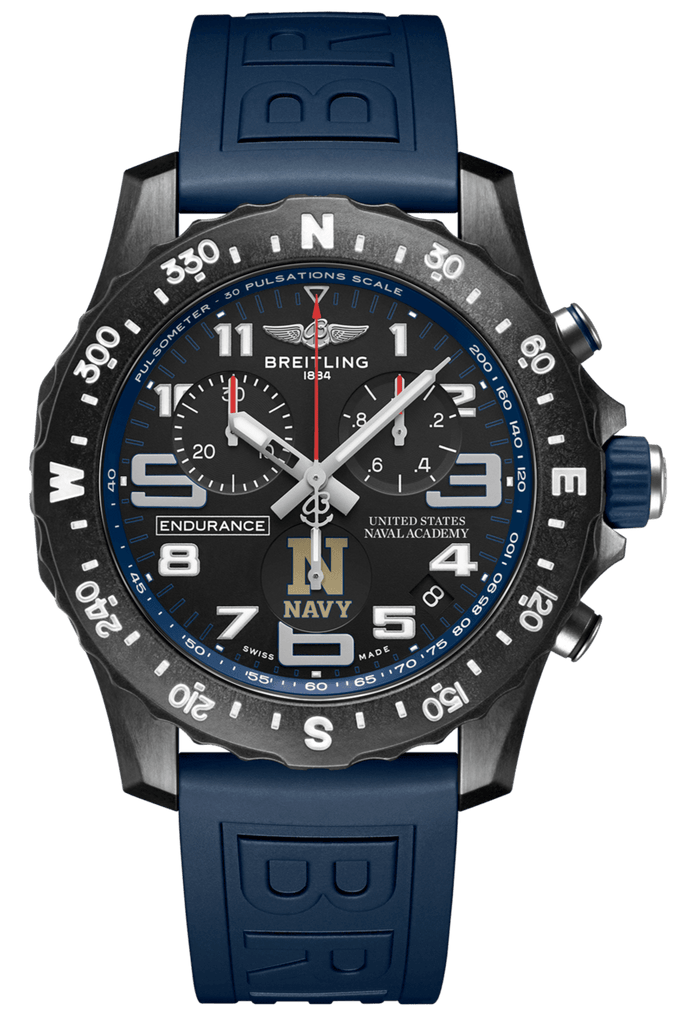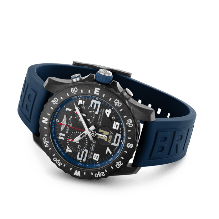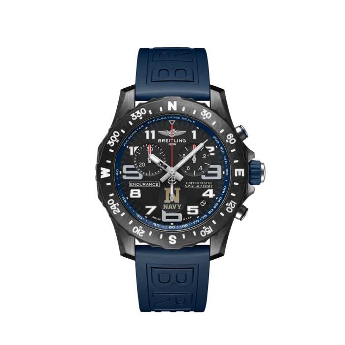 There's a reason we call our Endurance Pro “the ultimate athleisure watch.” It's because it can make the rounds from class to work to the gym without missing a beat. (Sound like a soon-to-be grad you know?) With its rubber strap and ultra-lightweight case, the Endurance Pro United States Naval Academy™ edition is as comfortable in the water as it is on land. Combine that with its easy readability, chronograph function and solar compass, and your gift search for a Navy grad is mission accomplished. Designed for men and women whose active lives blend a professional mindset with a sporty lifestyle, the Endurance Pro is equal to the challenges of a rigorous workout but fashionable enough for everyday wear. It is the ultimate athleisure watch. The Endurance Pro features an ultra-light Breitlight® case, a robust material 3.3 times lighter than titanium and 5.8 times lighter than stainless steel. Non-magnetic, thermally stable and hypoallergenic, Breitlight® is highly resistant to scratches, traction and corrosion. It also has a touch that is warmer than metal and a slightly textured effect accentuating the originality of the design. Exclusive to Breitling, it is 100% Swiss-made. Powering the Endurance Pro is Breitling’s Caliber 82, a COSC-certified SuperQuartz™ chronograph delivering exceptional precision.