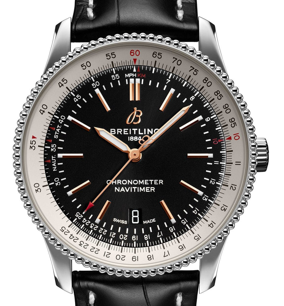 Refined and elegant, the Navitimer Automatic 41 combines the historic appeal of a true icon with the sophistication of a contemporary timepiece. Its conservative, 41mm stainless steel case is fitted with a classic black dial, and pared with the Navitimer's signature bidirectional rotating beaded bezel. The Navitimer Automatic 41 is powered by the Breitling Caliber 17, a COSC-certified chronometer.
