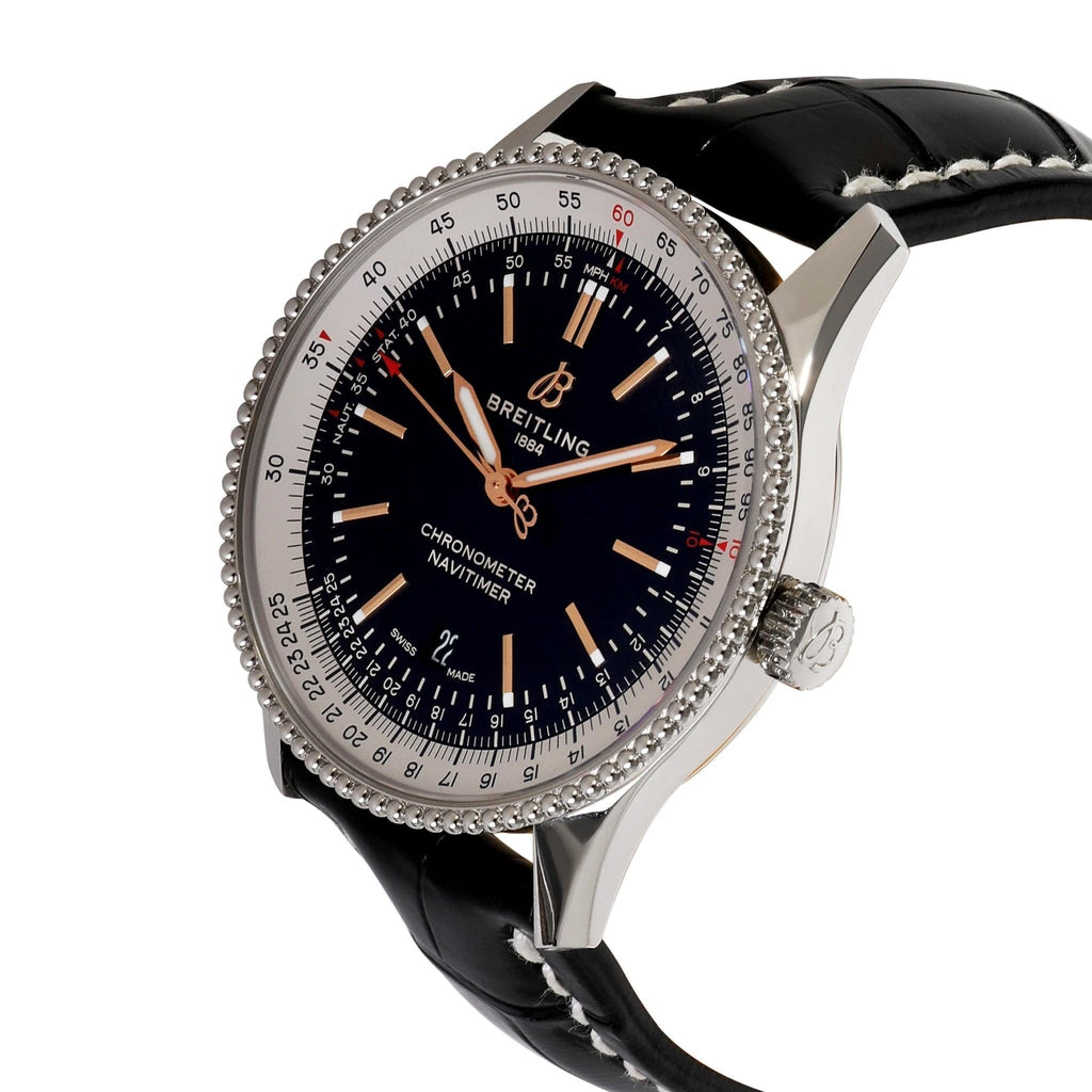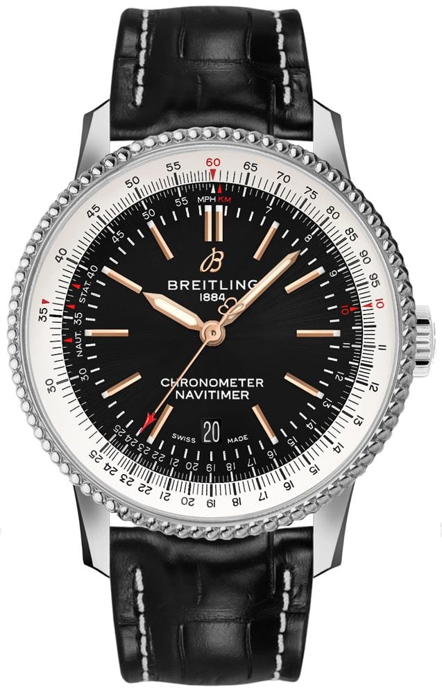 Breitling Navitimer Automatic (A17326211B1P2) self-winding automatic watch, features a 41mm stainless steel case surrounding a black dial on a black alligator strap with a stainless steel deployant buckle. Functions include hours, minutes, seconds, date and slide rule.