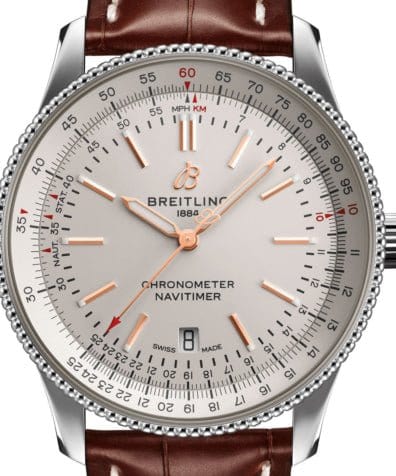A discreet date window sits at the 6 o’clock position on the dial, while the case features Breitling’s famous circular slide rule.