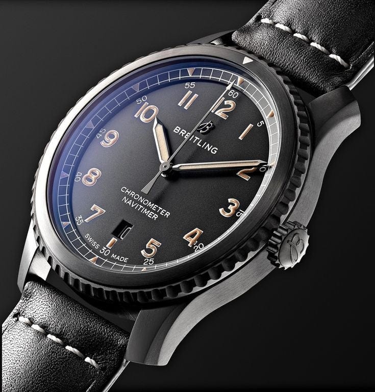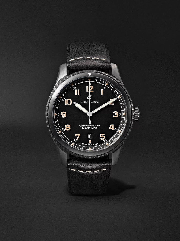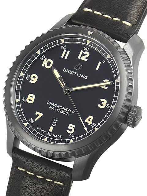 Breitling Navitimer 8 (M17314101B1X1) self-winding automatic watch, features a 41mm Blacksteel case surrounding a black dial on a black leather strap with a Blacksteel tang buckle. Functions include hours, minutes, seconds and date. This watch comes complete with box and papers. M
