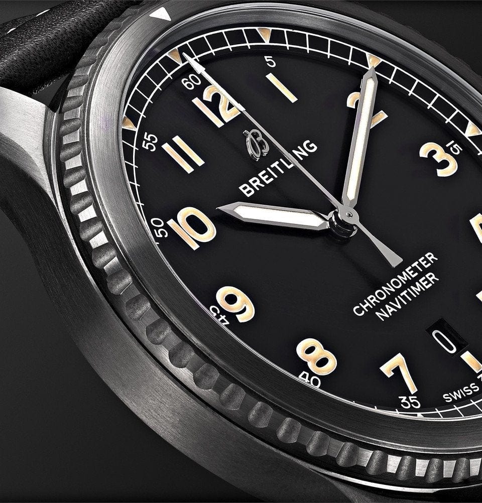 Breitling Navitimer 8 Automatic 41mm watch. Model reference: M17314101B1X1. The iconic timepiece is a combination of watchmaking craftsmanship and a stylish design created to meet the need of professional pilots. Its rounded 41mm case of 10.74mm thickness is made of polished stainless steel and features a bidirectional rotating bezel. The black dial has a painted scale, applied Arabic Numerals, and sword-shaped hands with luminous fill for hour and minute marking.