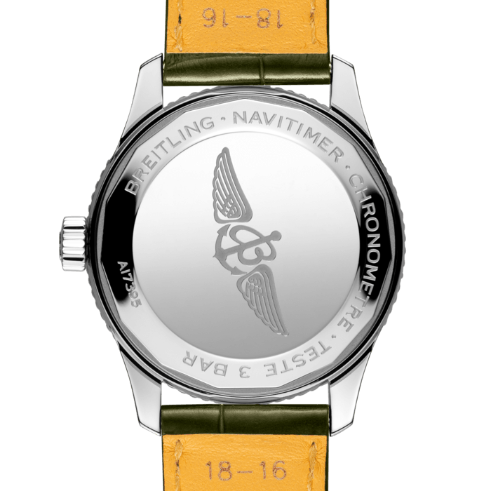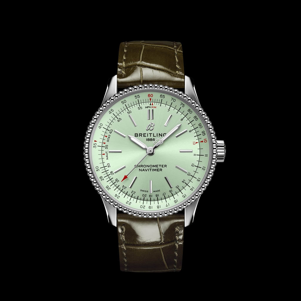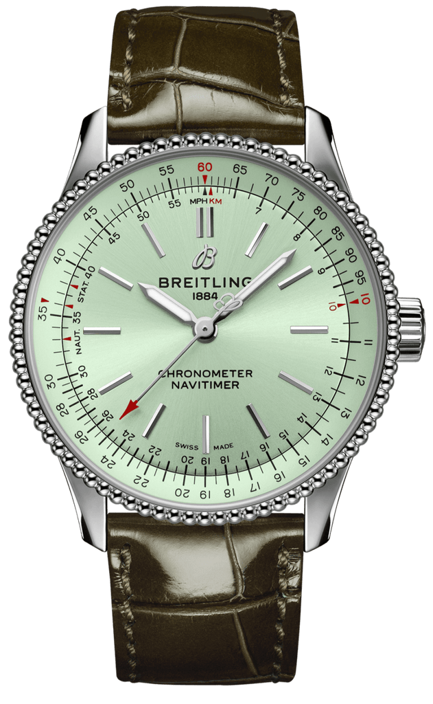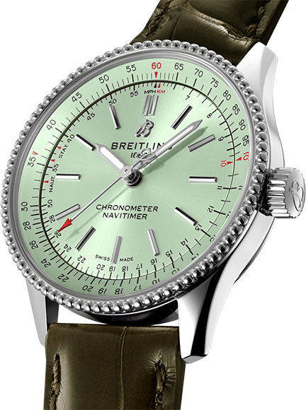 Refined and elegant, the Navitimer Automatic 35 combines the historic appeal of a true icon with the sophistication of a contemporary timepiece. Available in a variety of materials including stainless steel and 18k red gold, the 35 mm case features a beaded bezel and a range of elegant dial colors, as well as diamond-set white mother of pearl. Offered either with a matching bracelet or alligator strap that fits both a stainless steel pin or folding buckle, the Navitimer Automatic 35 is powered by the Breitling Caliber 17, a COSC-certified chronometer.
