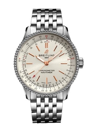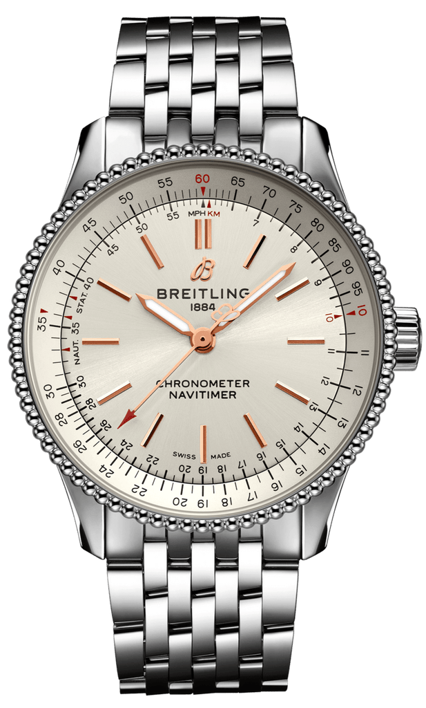 Refined and elegant, the Navitimer Automatic 35 combines the historic appeal of a true icon with the sophistication of a contemporary timepiece. Available in a variety of materials including stainless steel and 18k red gold, the 35 mm case features a beaded bezel and a range of elegant dial colors, as well as diamond-set white mother of pearl. Offered either with a matching bracelet or alligator strap that fits both a stainless steel pin or folding buckle, the Navitimer Automatic 35 is powered by the Breitling Caliber 17, a COSC-certified chronometer.