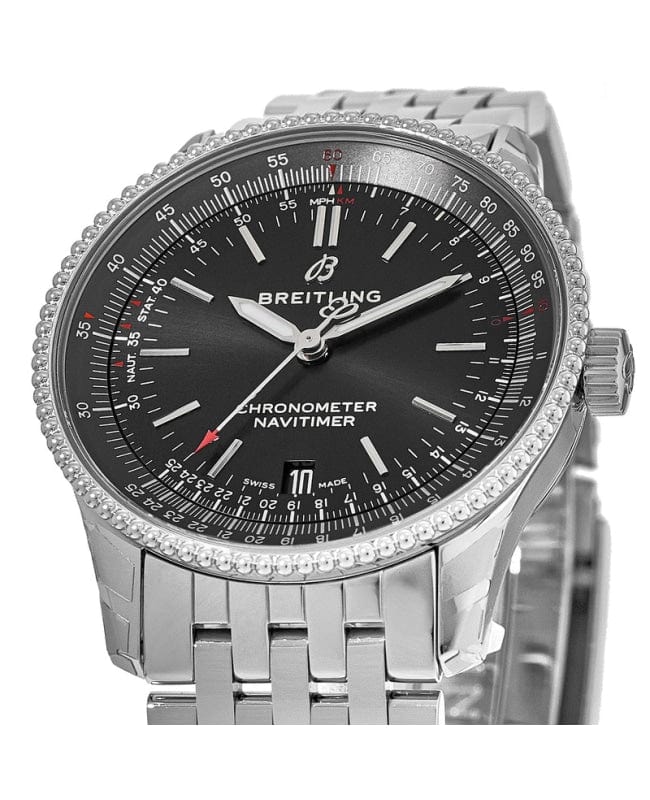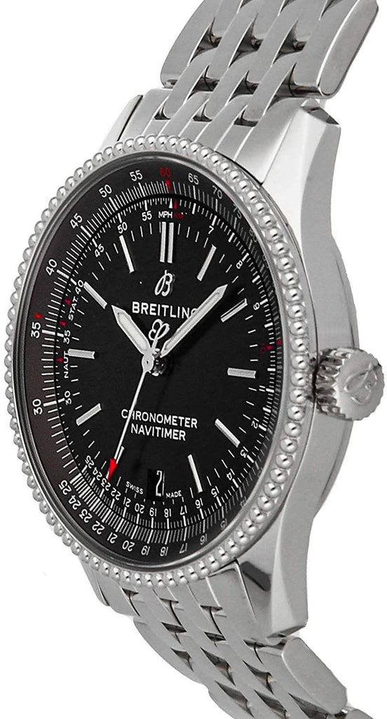 Stainless steel case with a stainless steel bracelet. Bi-directional rotating stainless steel bezel. Black dial with luminous silver-tone hands and index hour markers. Minute markers. Tachymeter scale around the outer rim. Dial Type: Analog. Luminescent hands and markers. Date display at the 6 o'clock position. Breitling calibre 17 automatic movement, based upon ETA 2824-2, containing 25 Jewels, bitting at 28800 vph, and has a power reserve of approximately 42 hours. Scratch resistant sapphire crystal. Pull / push crown. Solid case back. Round case shape. Case size: 38 mm. Case thickness: 10.10 mm. Band width: 20 mm. Deployment clasp. Water resistant at 30 meters / 100 feet. Functions: date, hour, minute, second, chronometer. Navitimer Series. Luxury watch style. Watch label: Swiss Made. Breitling Navitimer 38 mm Automatic Chronometer Black Dial Men's Watch A17325241B1A1.