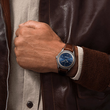 Stainless steel 38mm case. Sapphire crystal glass. Blue dial flange with silver Tachymeter scale, luminous hands and stick hour markers. Stainless steel crown. Stainless steel uni-directional bezel. Stainless steel lugs. Hours, minutes, seconds and date. Date located at 6 o'clock position. Brown crocodile leather strap and stainless steel pin buckle. Automatic movement with Breitling COSC Certified caliber 17, beats at 28,800 vph, contains 25 jewels & has an approximate power reserve of 40 hours. Water resistant 30m/100ft.