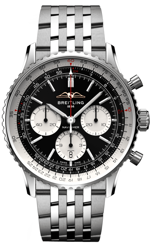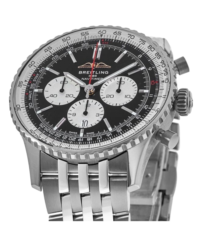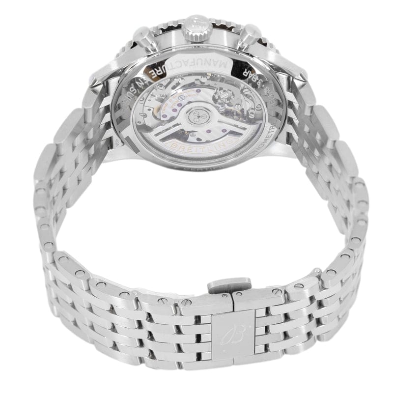 This Navitimer timepiece features a 43mm stainless steel case with a notched bezel for easy grip.