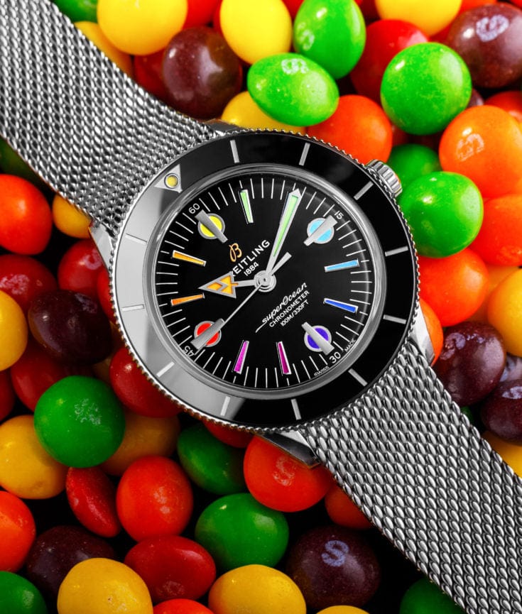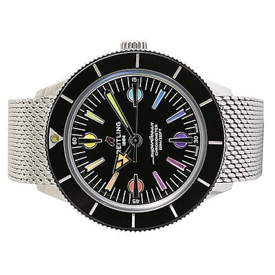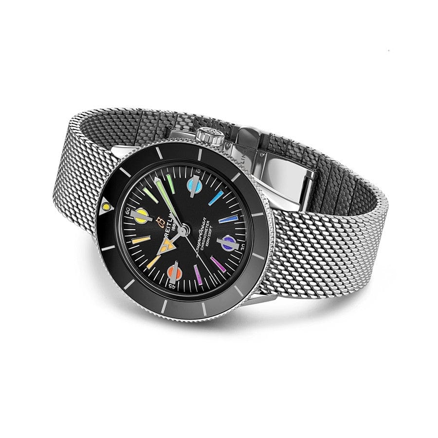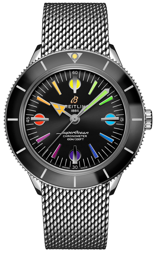Paired with a mesh bracelet or a black calfskin leather strap that fits both a stainless-steel pin or folding buckle, this colorful Superocean Heritage ‘57 is powered by the Breitling Caliber 10, a COSC-certified chronometer.