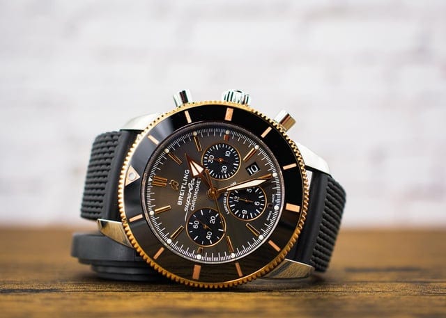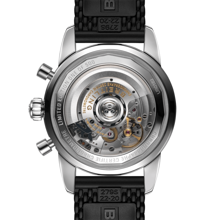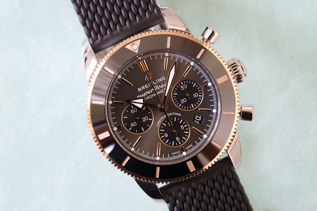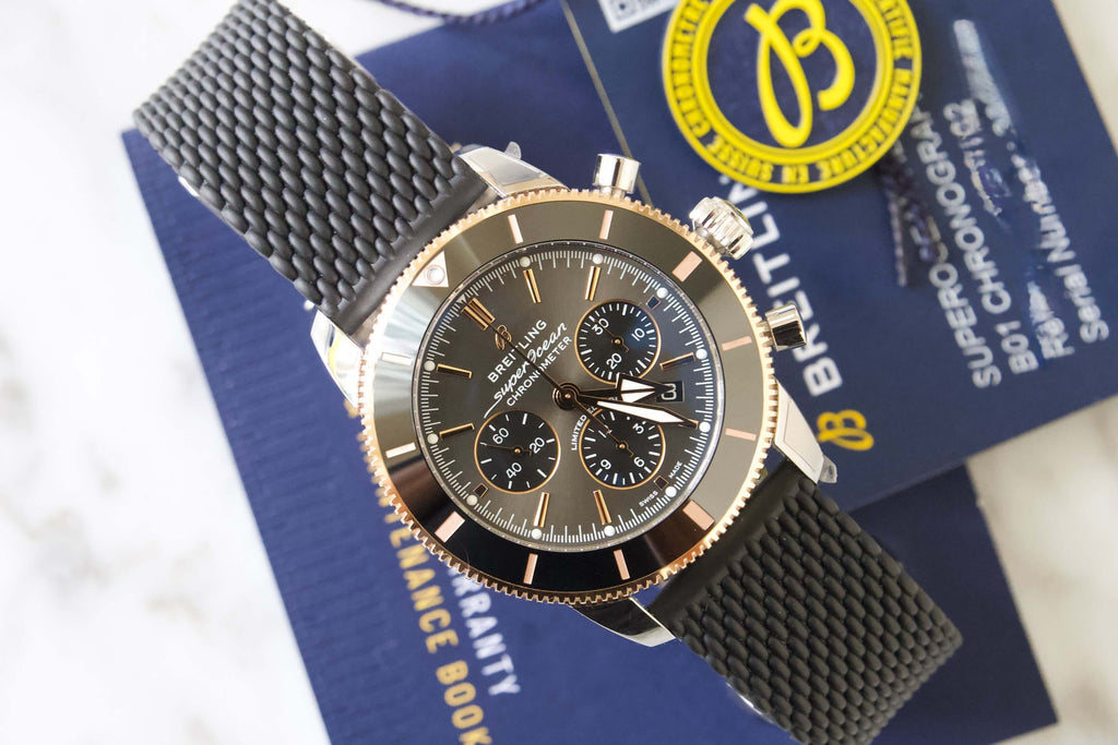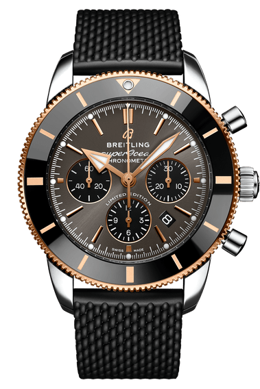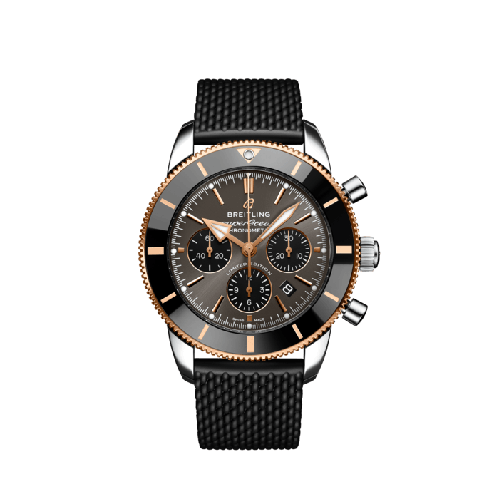 Featuring the iconic triangular-shaped hands as well as a unidirectional bezel with a polished ceramic ring, the Superocean Heritage is an elegant looking diver’s watch. Available here in stainless steel and 18k red gold, this Superocean Heritage B01 Chronograph 44 features a black-eye gray dial. Offered with a “mesh-styled” black rubber strap fitting a folding buckle, this Superocean Heritage is powered by the in-house Breitling Manufacture Caliber 01, a COSC-certified chronometer.