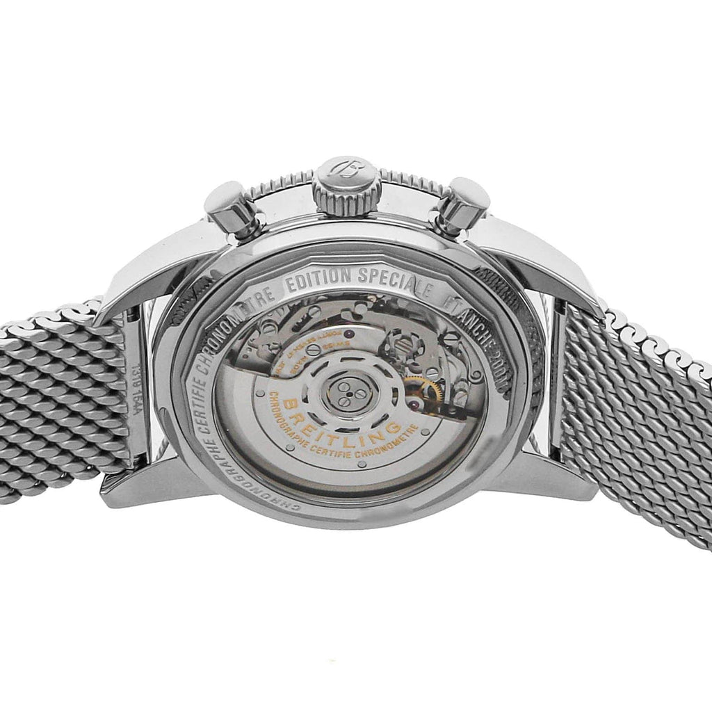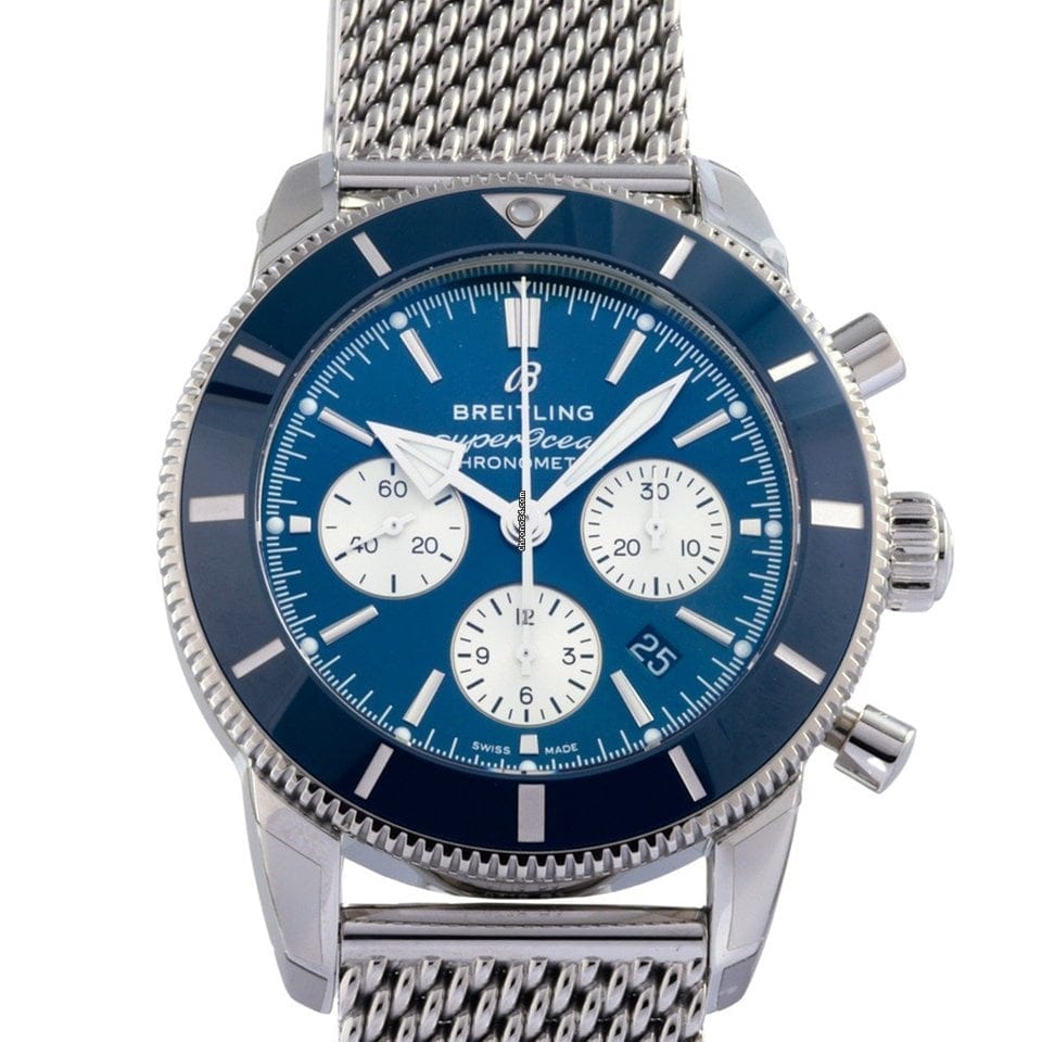 Featuring the iconic triangular-shaped hands as well as a unidirectional bezel with a polished ceramic ring, the Superocean Heritage is an elegant looking diver’s watch. Available in a variety of materials including stainless steel and 18k red gold, the Superocean Heritage B01 Chronograph 44 features a range of black, blue, silver, or green dials. Offered either with a matching mesh bracelet, or a “mesh-styled” rubber strap fitting a folding buckle, this Superocean Heritage is powered by the in-house Breitling Manufacture Caliber 01, a COSC-certified chronometer.