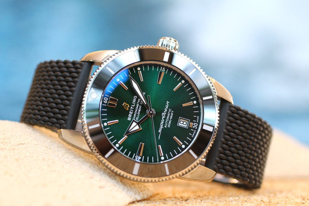 Available in a variety of sizes and materials including stainless steel and 18k red gold, the Superocean Heritage B20 Automatic features a range of colored dials. Offered either with a matching mesh bracelet, or a “mesh-styled” rubber strap fitted with a folding buckle, this Superocean Heritage is powered by the Breitling Manufacture Caliber B20, a COSC-certified chronometer based on the Tudor Caliber MT5612.