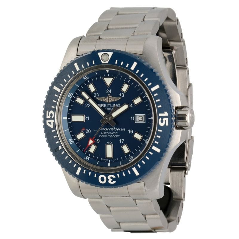 Breitling Superocean 44 SpecialReference: Ref. Y1739316/C959/162AGender: man´s watchWatchcase: Stainless steel, diameter ca. 44 mm, height ca. 14,2 mm, bolted bottom and crown, water resistant to 100 atm, sapphire glass, turnable bezel ceramicClockwork-functions: Automatic Chronometer, hours, minutes, second, dateDial: Blue dial, luminous hands and luminous markersStrap: Stainless steel watchstrapAuthenticity: Jeweler Miquel warrants for the authenticity of the offered watch. Box and certificates: Original box and papersFeatures: ChronometerState of preservation: Unworn Watch