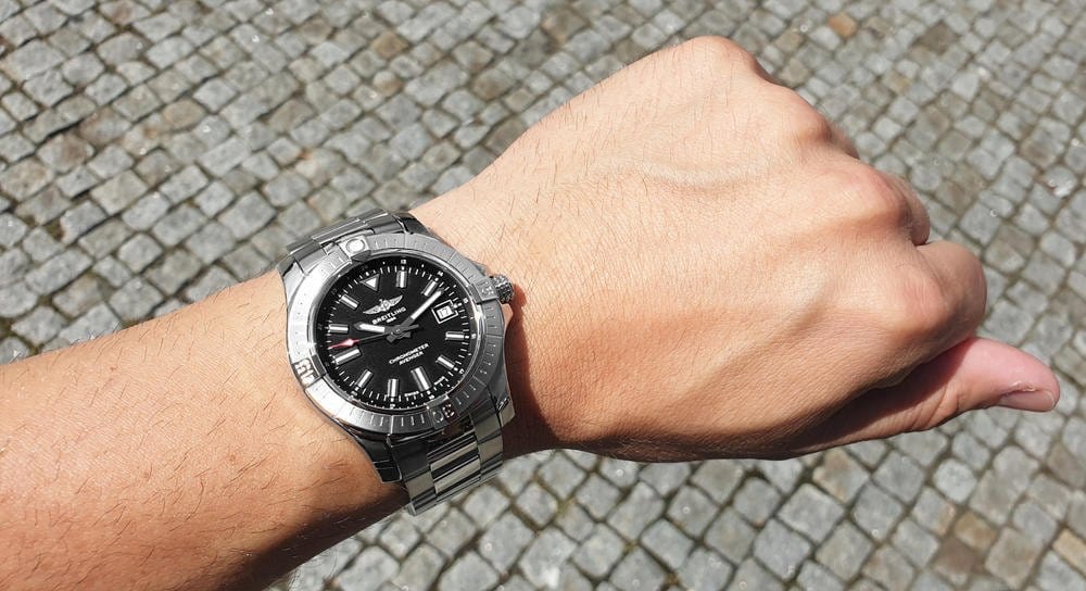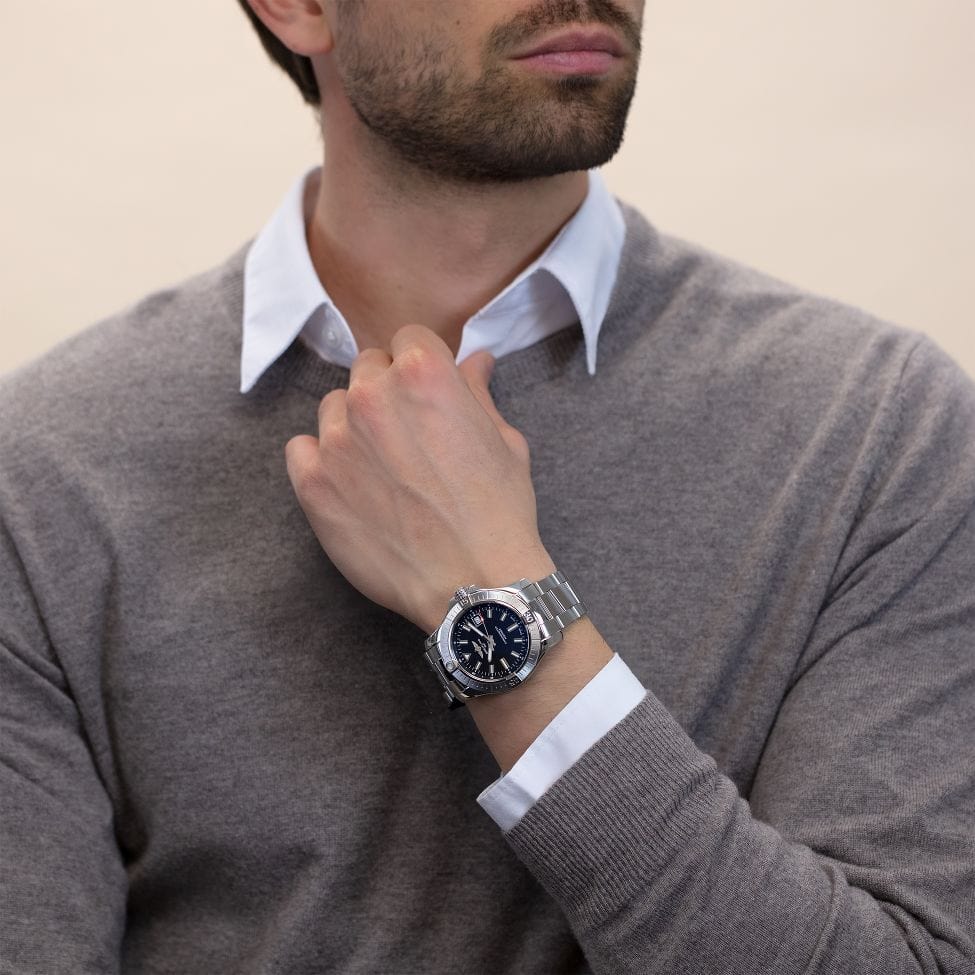 Bold, extremely robust and shock resistant, the Avenger Automatic 43 features a clean dial offering optimal legibility. As a true Breitling Avenger, it can be used wearing gloves and offers unrivalled safety and reliability to any airborne adventurer. The Avenger Automatic 43 features a sturdy 43mm stainless-steel case, colorful dial and a choice of a stainless-steel bracelet, or matching military leather strap that fits either a stainless-steel pin buckle or folding clasp. Thanks to its rugged bezel and its special grip-pattern on the crown, the Avenger Automatic 43 can be easily operated wearing gloves.