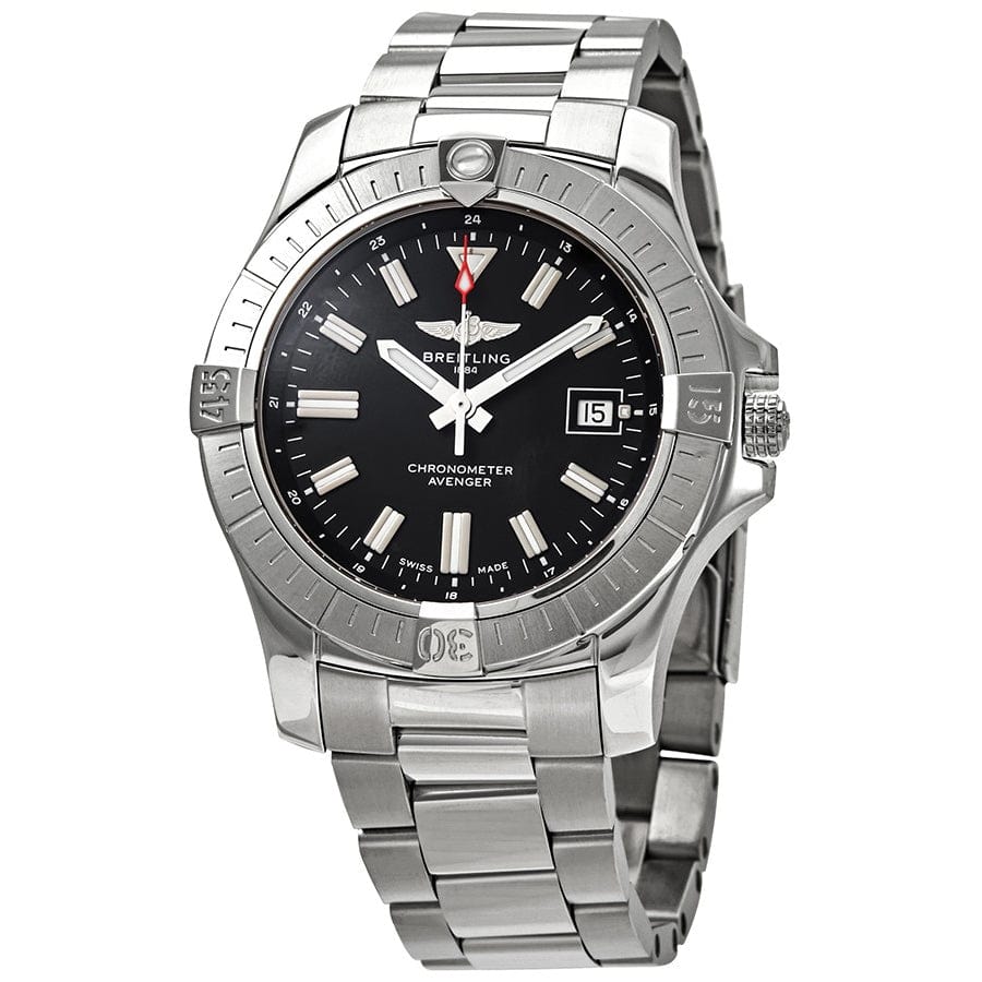 The Breitling Avenger Automatic 43mm is bold and reliable. Aesthetically pleasing to the eye with its clean black dial featuring Super-LumiNova hands and indices, the rugged bezel and special grip-pattern on the crown offer easy operation to any airborne adventurer. Housed in a stainless steel case and fitted on a matching metal bracelet that provides extra comfort for wearing on the wrist. Self-winding mechanical movement powered by Breitling 17 Calibre, this watch is for the daring gentleman.