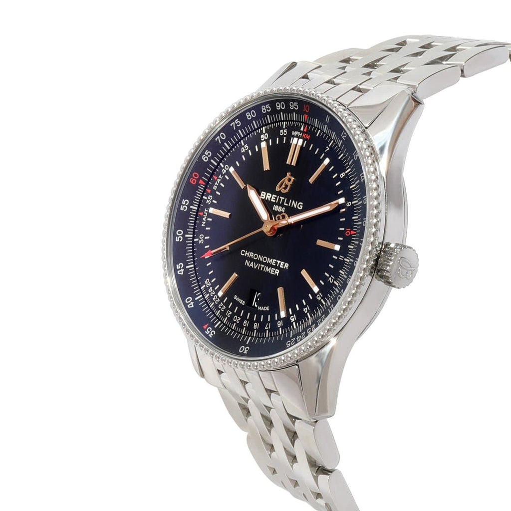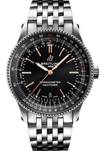 Refined and elegant, the Navitimer Automatic 41 combines the historic appeal of a true icon with the sophistication of a contemporary timepiece. Available in a variety of materials including stainless steel and 18k red gold, the 41 mm case features a beaded bezel and a range of elegant dial colors. Offered either with a matching bracelet or alligator strap that fits both a stainless-steel pin or folding buckle, the Navitimer Automatic 41 is powered by the Breitling Caliber 17, a COSC-certified chronometer.