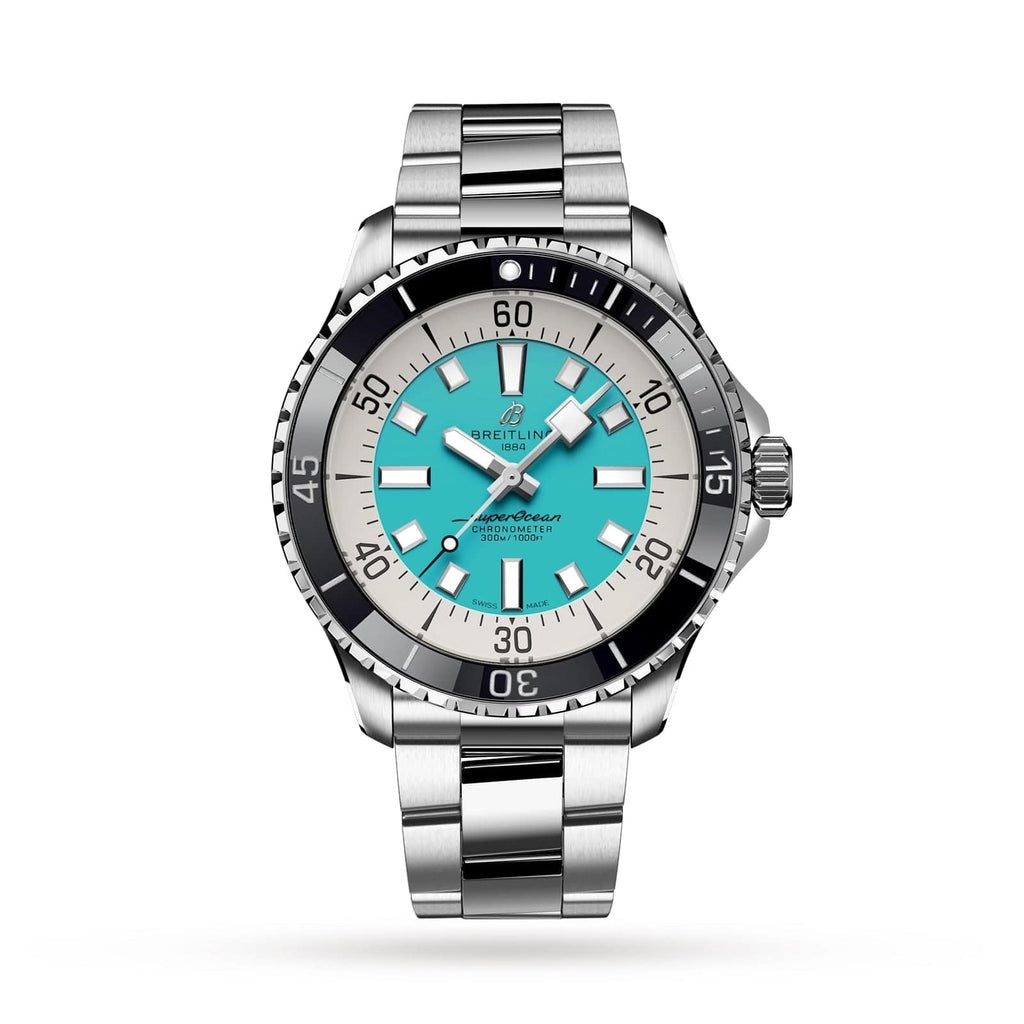 This 44m Superocean model features a striking turquoise dial designed to provide maximum legibility. Framed by a unidirectional bezel, this timepiece offers ultimate safety during even the deepest of dives.