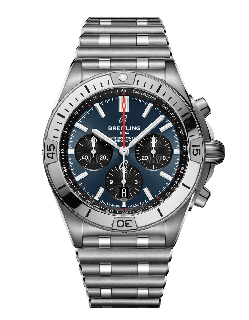 This Chronomat B01 42 is characterised by a robust, stainless steel case, the iconic bezel with four rider tabs, and the signature Rouleaux bracelet.