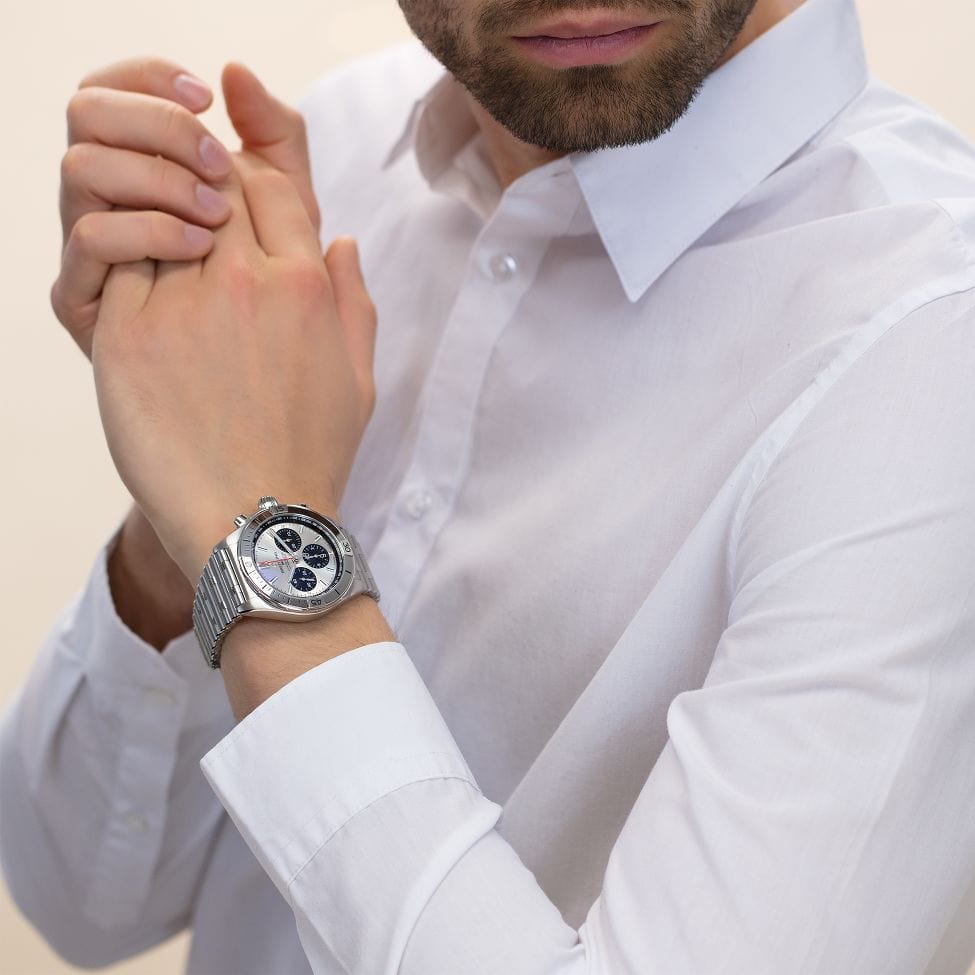Breitling’s all-purpose watch for your every pursuit. The Chronomat holds a significant place in Breitling’s history. Introduced in 1984, at a time where extra-thin quartz timepieces were the order of the day, Breitling placed a bold bet on an impressively proportioned mechanical watch. Based on the Frecce Tricolori chronograph, which had been developed and launched in 1983 in collaboration with the famed Italian aerial squadron, the Chronomat celebrated Breitling’s centenary in style and marked the return of the mechanical chronograph to its rightfully prominent place at the brand which had built its global reputation on these incredible watches. Available in a variety of materials including stainless steel and 18k red gold, the Chronomat features a 42 mm case and the iconic bezel with the four rider tabs. Available with a range of black, blue, silver, and copper dials, the Chronomat is matched to the signature “Rouleaux” bracelet and is powered by the in-house Breitling Manufacture Caliber 01, a COSC-certified chronometer.
