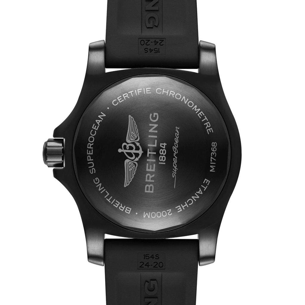 Power, functionality and cool, contemporary style define Breitling’s Superocean Automatic collection: tool watches for the active, modern diver. Built to last, the Superocean Automatic 46 features a sturdy 46-mm black steel (DLC-coated stainless steel) case, black dial and a matching Diver Pro III rubber strap with pin buckle or folding clasp. Complete with ratcheted unidirectional bezel, and water-resistant up to an impressive 200 bar (2000 meters), it is the ultimate in robustness and reliability for deep-sea adventurers.