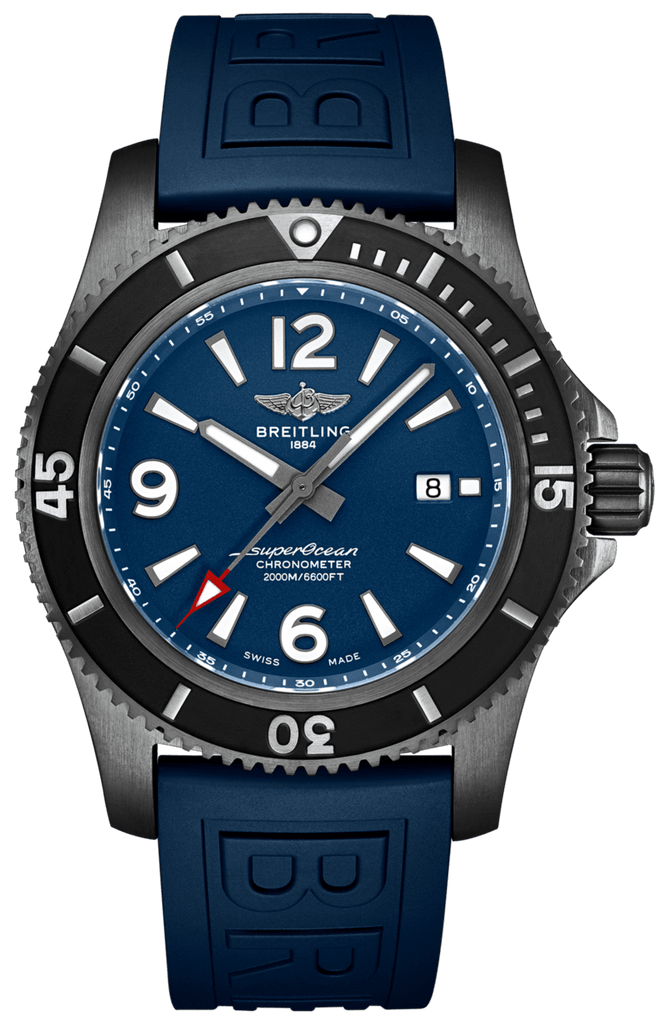Breitling Men’s Watch Superocean Automatic 46 Black Steel, DLC-Coated Stainless Steel, 46mm. Blue dial with applied large luminous index hour markers and applied polished Large Arabic numerals mark the 6, 9, and 12 o’clock positions. Luminescent hour and minute hands. Minute markers around the outer rim. The date displayed at the 3 o’clock position. Screw-locked crown with two gaskets. Convex sapphire crystal, glare-proofed both sides. The Bidirectional DLC-Coated Stainless Steel bezel with a black ceramic bezel insert. Breitling Caliber 17 contains 25 Jewels and has an approximate power reserve of 38 hours. The watch presented on a Diver Pro III Blue Rubber Strap with Tang Buckle Clasp. The water resistance is up to 2000m/6600ft.