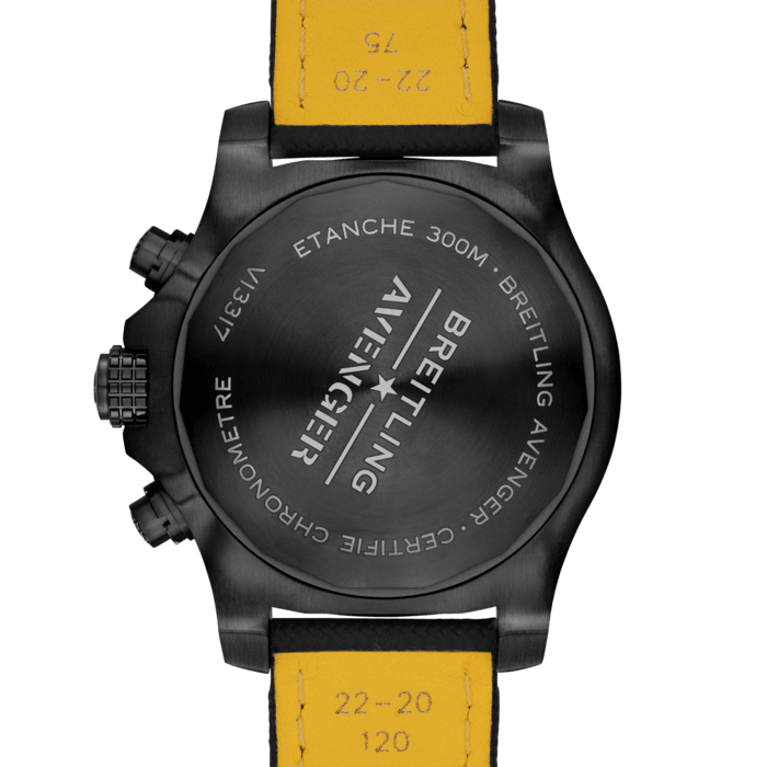 Bold, extremely robust and shock resistant, the Avenger Chronograph 45 Night Mission combines precision with a powerful design in a lightweight case. As a true Breitling Avenger, it can be used wearing gloves and offers unrivalled safety and reliability to any airborne adventurer. The Night Mission interpretation of the Avenger Chronograph 45 features a sturdy 45mm DLC-coated titanium case, black or khaki dial and a matching black or khaki military leather strap that fits either a DLC-coated stainless-steel pin buckle or folding clasp. Its specific Arabic numerals recall the stenciled numbers used on the decks of aircraft carriers. Thanks to its rugged bezel and its special grip-pattern on the crown & chronograph pushers, the Avenger Chronograph 45 Night Mission can be easily operated wearing gloves.