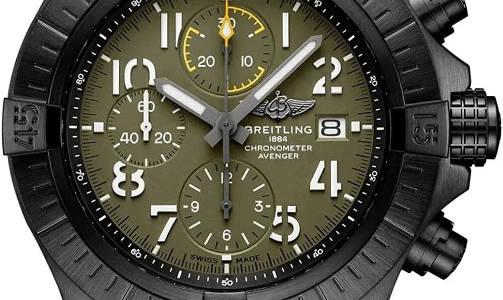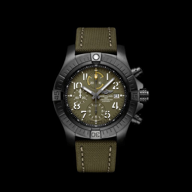 Bold, extremely robust and shock resistant, the Avenger Chronograph 45 Night Mission combines precision with a powerful design in a lightweight case. As a true Breitling Avenger, it can be used wearing gloves and offers unrivalled safety and reliability to any airborne adventurer. The Night Mission interpretation of the Avenger Chronograph 45 features a sturdy 45mm DLC-coated titanium case, black or khaki dial and a matching black or khaki military leather strap that fits either a DLC-coated stainless-steel pin buckle or folding clasp. Its specific Arabic numerals recall the stenciled numbers used on the decks of aircraft carriers. Thanks to its rugged bezel and its special grip-pattern on the crown & chronograph pushers, the Avenger Chronograph 45 Night Mission can be easily operated wearing gloves.