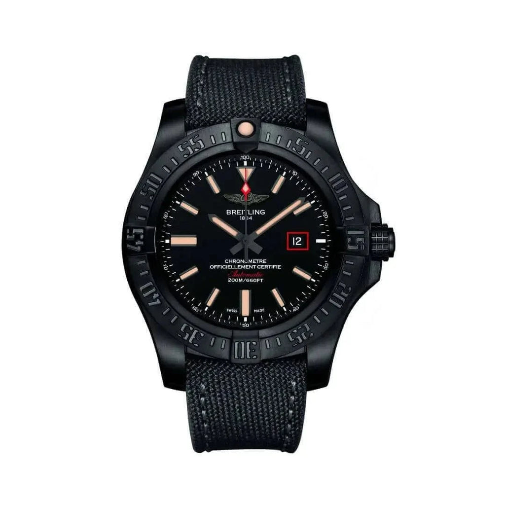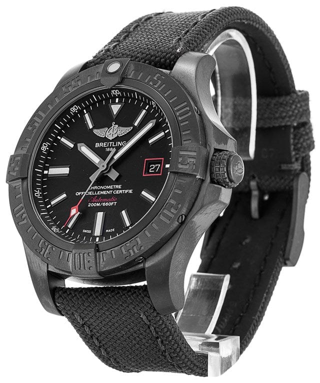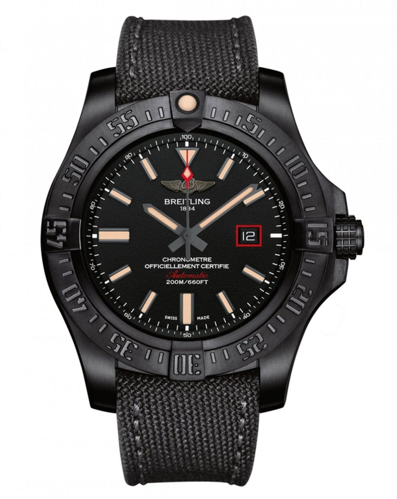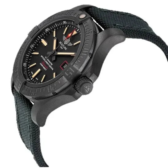 44.00mm black titanium case, screwed in back, screw-locked crown with two gaskets, ratcheted unidirectional black bezel, cambered sapphire crystal with glareproof treatment on both sides, Volcano black dial, selfwinding mechanical Breitling 17 movement with date display, 40 hours of power reserve, anthracite military strap with tang-type buckle. Water resistant to 200 m (660 ft).