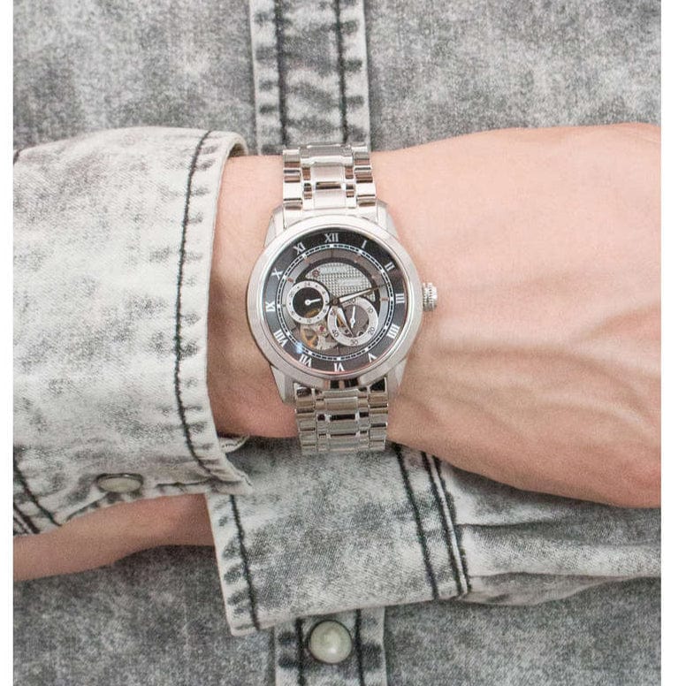 With stand out silver mini dials, this mens automatic watch from Bulova has a distinctive look. Featuring a 42 x 12mm stainlees steel case with a black dial and silver tone hour markers and hands. Finished with a 22mm brushed and polished bracelet with a double push button folding clasp. The automatic movement means there is no battery to replace.